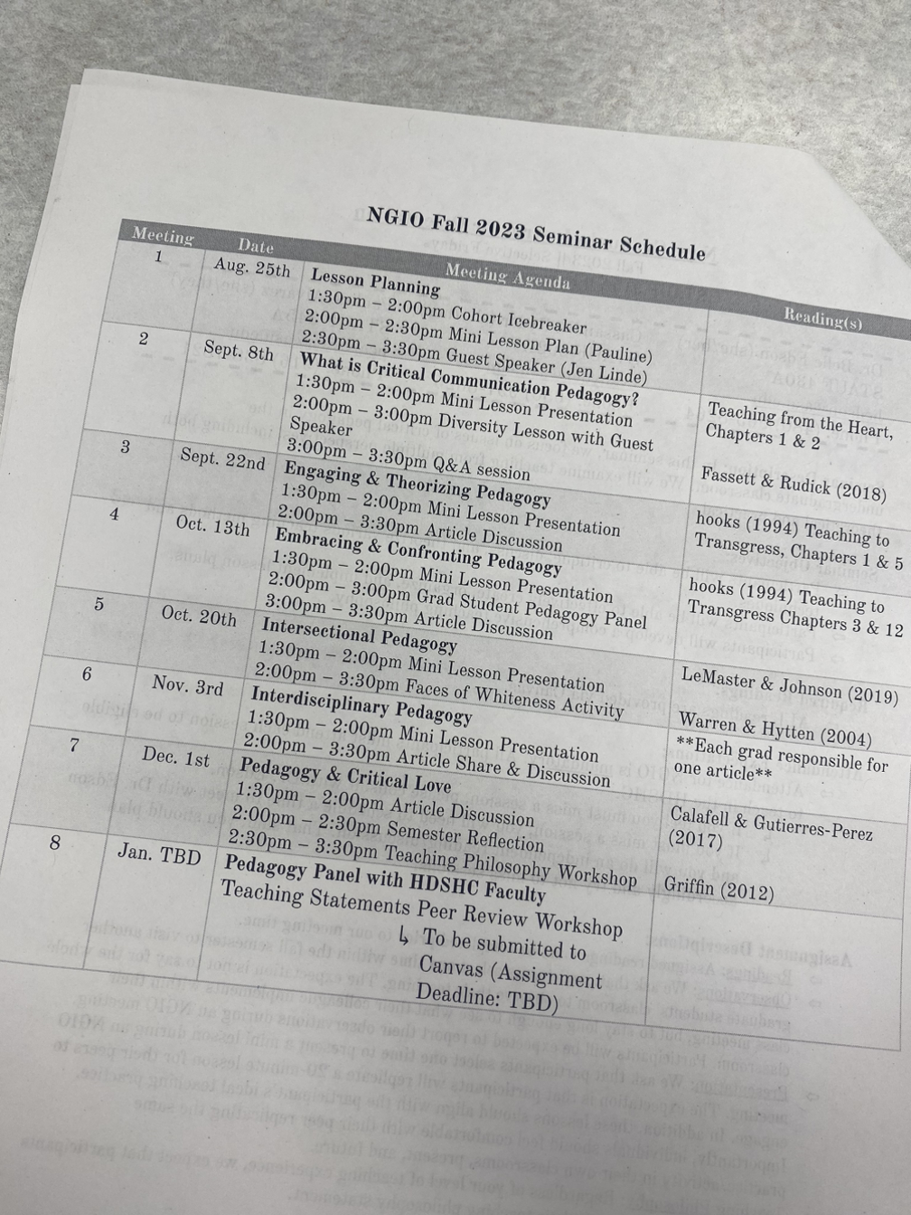 학기 중에도 약 7번의 세미나를 통해 수업에 대한 경험을 나누고 교육 신념 (Pedagogical philosophy)에 대해서 얘기하는 시간을 갖는다. 커뮤니케이션 학과답게 Critical Cultural Communication을 통한 교육 방법론을 강조하는데, 간단히 말해서 학생들의 개개인 정체성을 존중하라는 것이다. 교사는 학생에 비해 권력이 있는 위치에 있을 수 있으므로 이를 인지할 것, 수업 강의 외에도 평상시 학생들과의 소통에서도 커뮤니케이션 시스템이 이루어진다는 것, 다양한 언어와 다양성을 존중할 것 등이다.