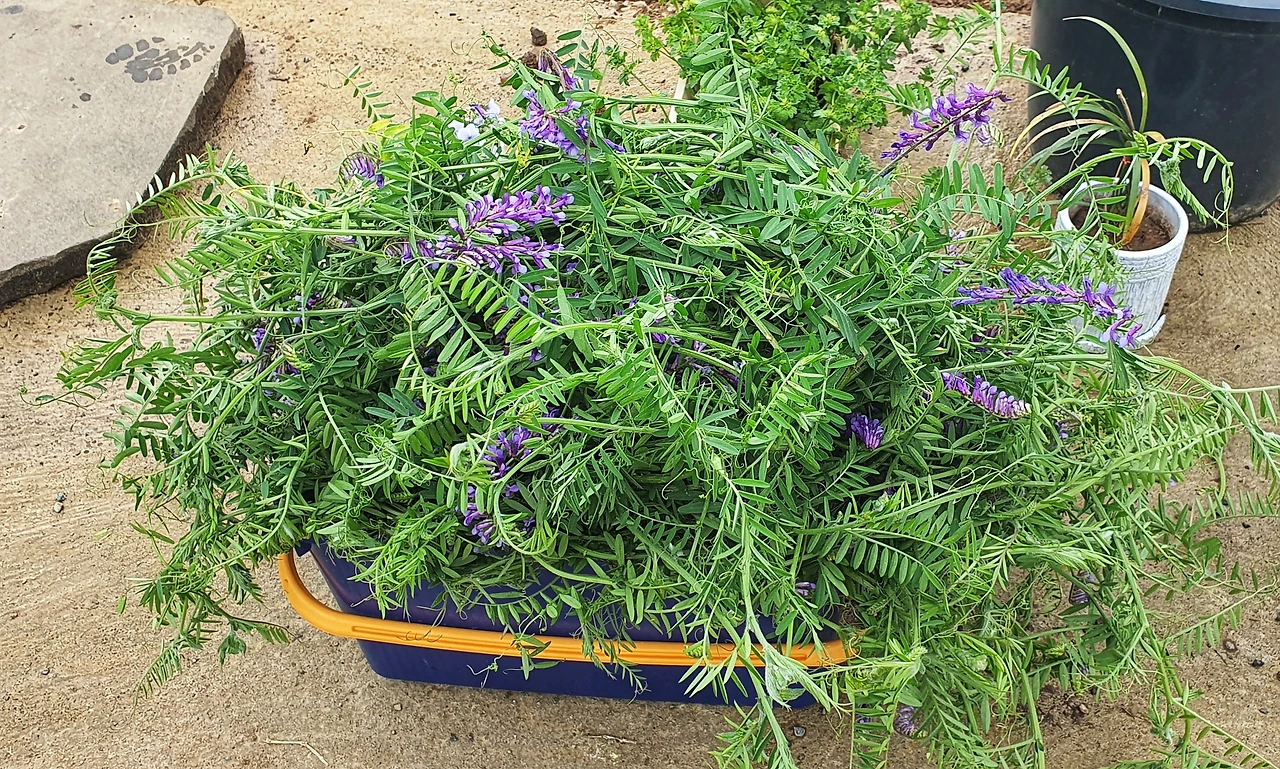 헤어리베치는 길가나 저수지 근처에서 자주 볼 수 있습니다. 우리 과수원땅에도 군데군데 자라고 있어요. 5월에 일굴 텃밭 땅에 뿌려주려고 한아름 걷어왔습니다.