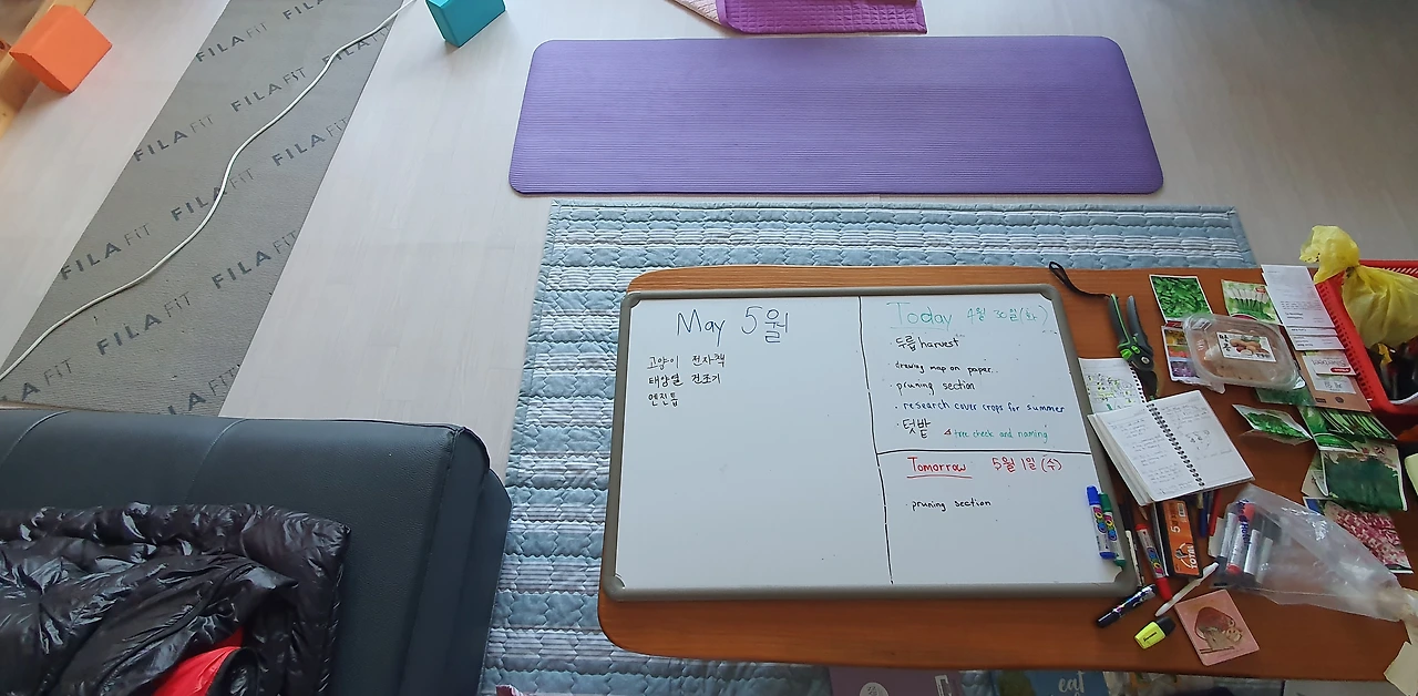 5월이 되었습니다. 5월에 집중할 목록을 적고있어요. 전날 밤 인요가를 하던 요가매트도 보이네요. 인요가는 한동작을 오랫동안 홀딩하기때문에 스트레칭하듯 근육을 풀어주는데 좋습니다.