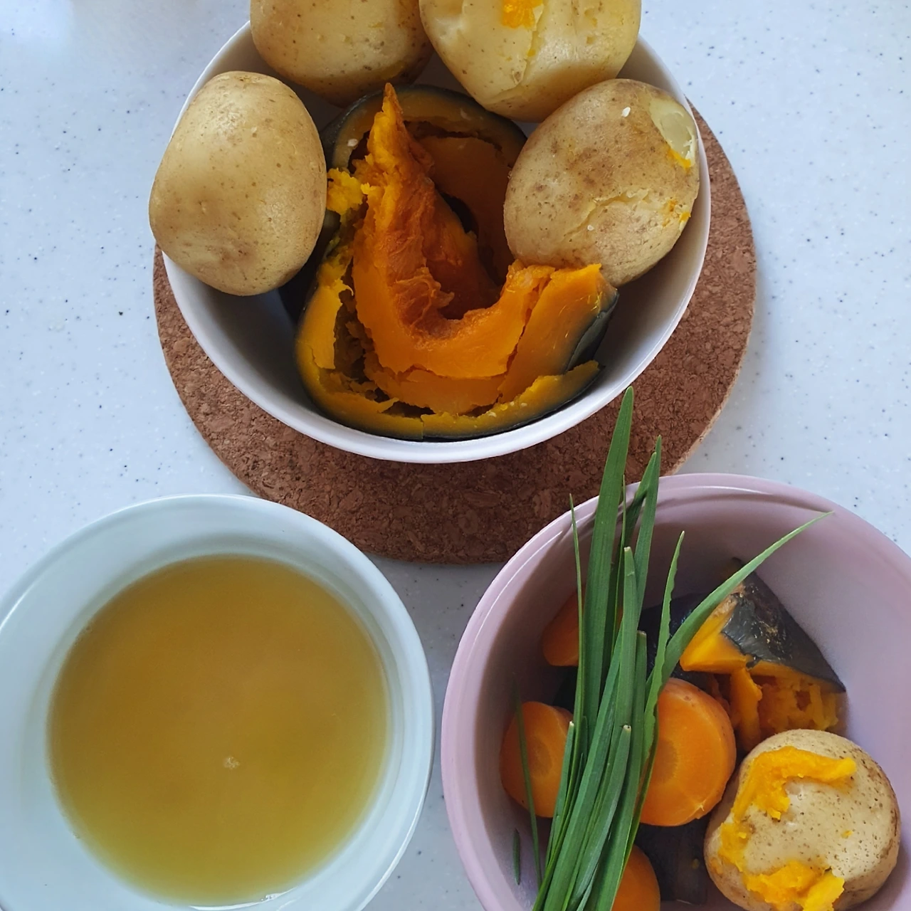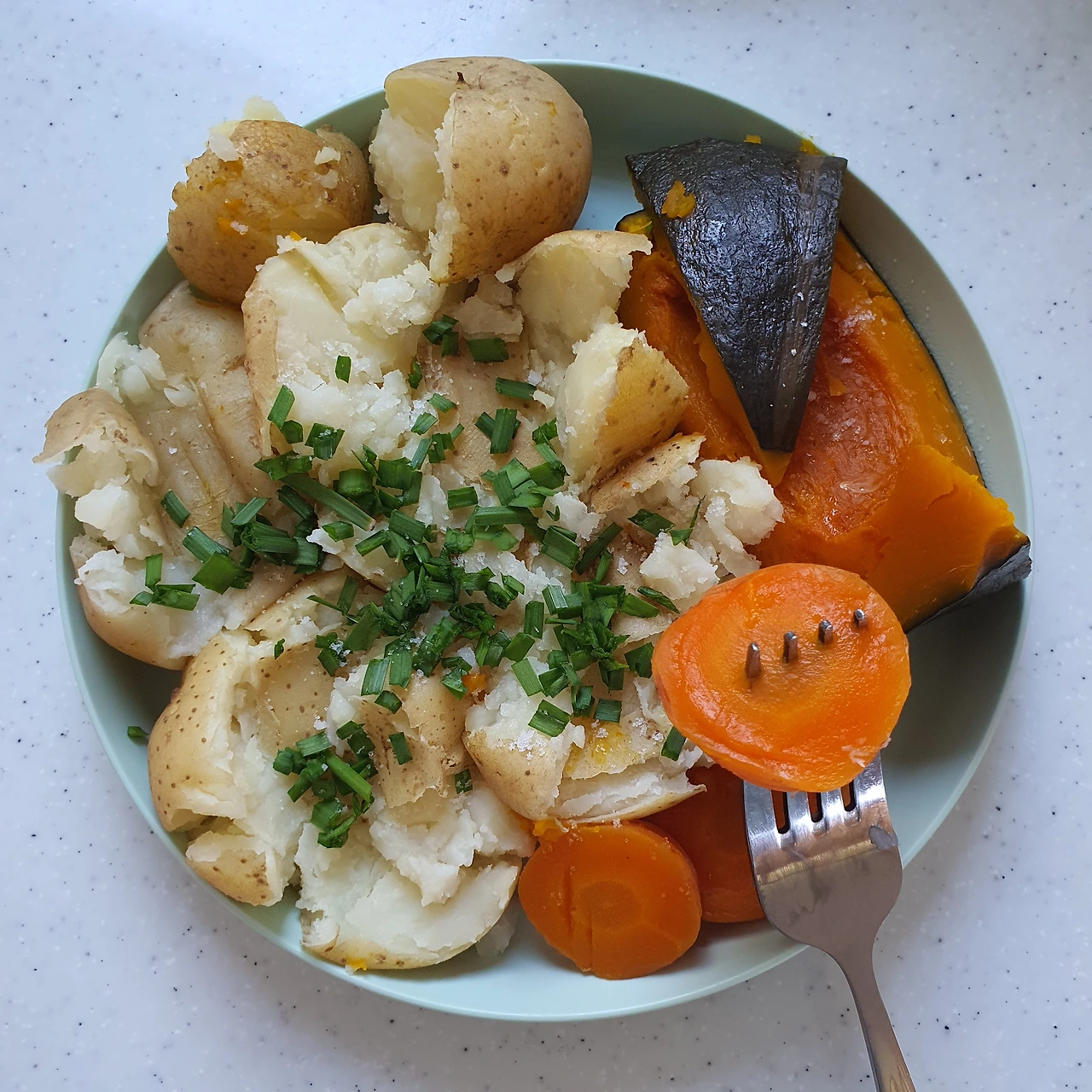 어느 날은 간단하게 감자랑 단호박, 당근을 쪄서 갈릭차이브 올리고 스프랑 먹기도 하고,