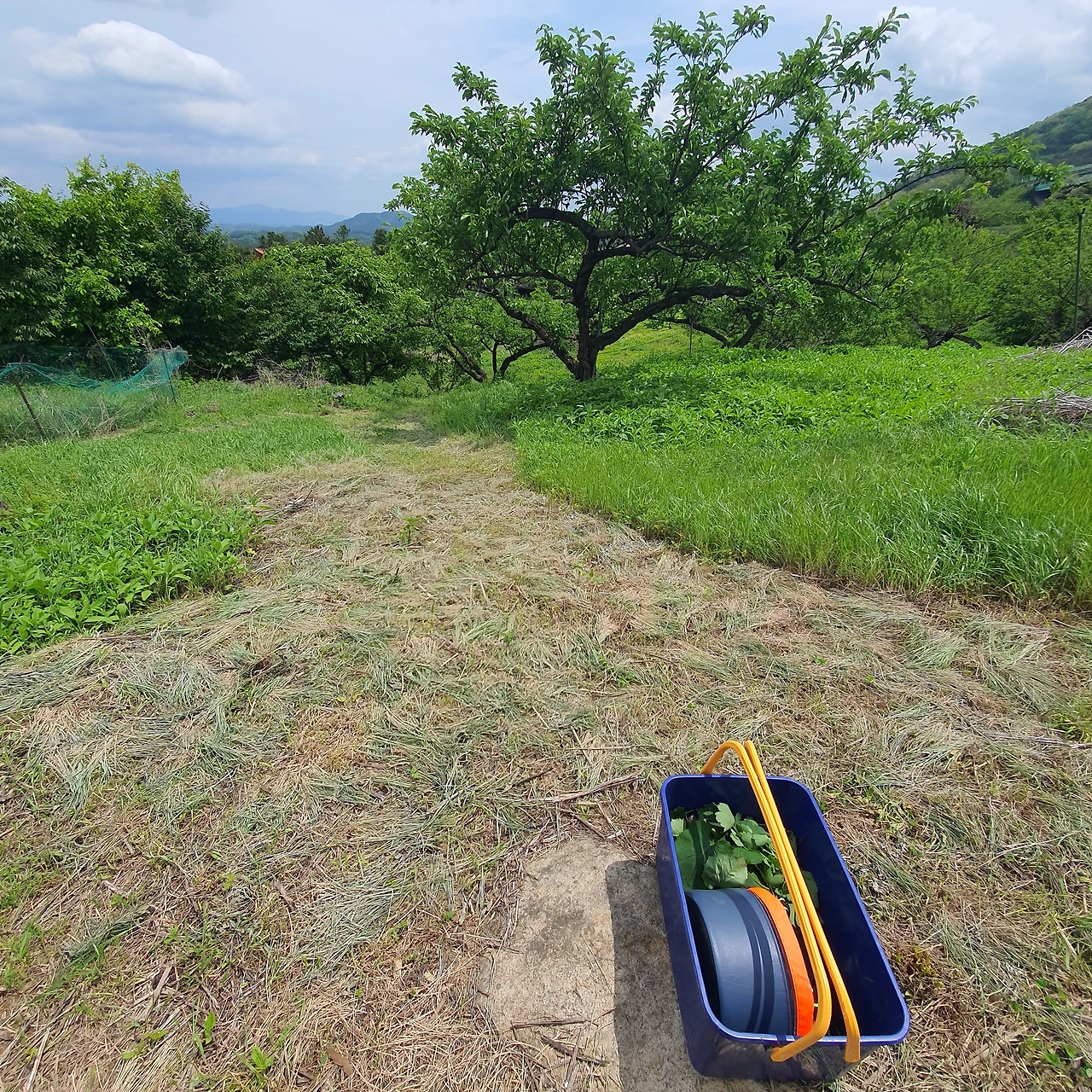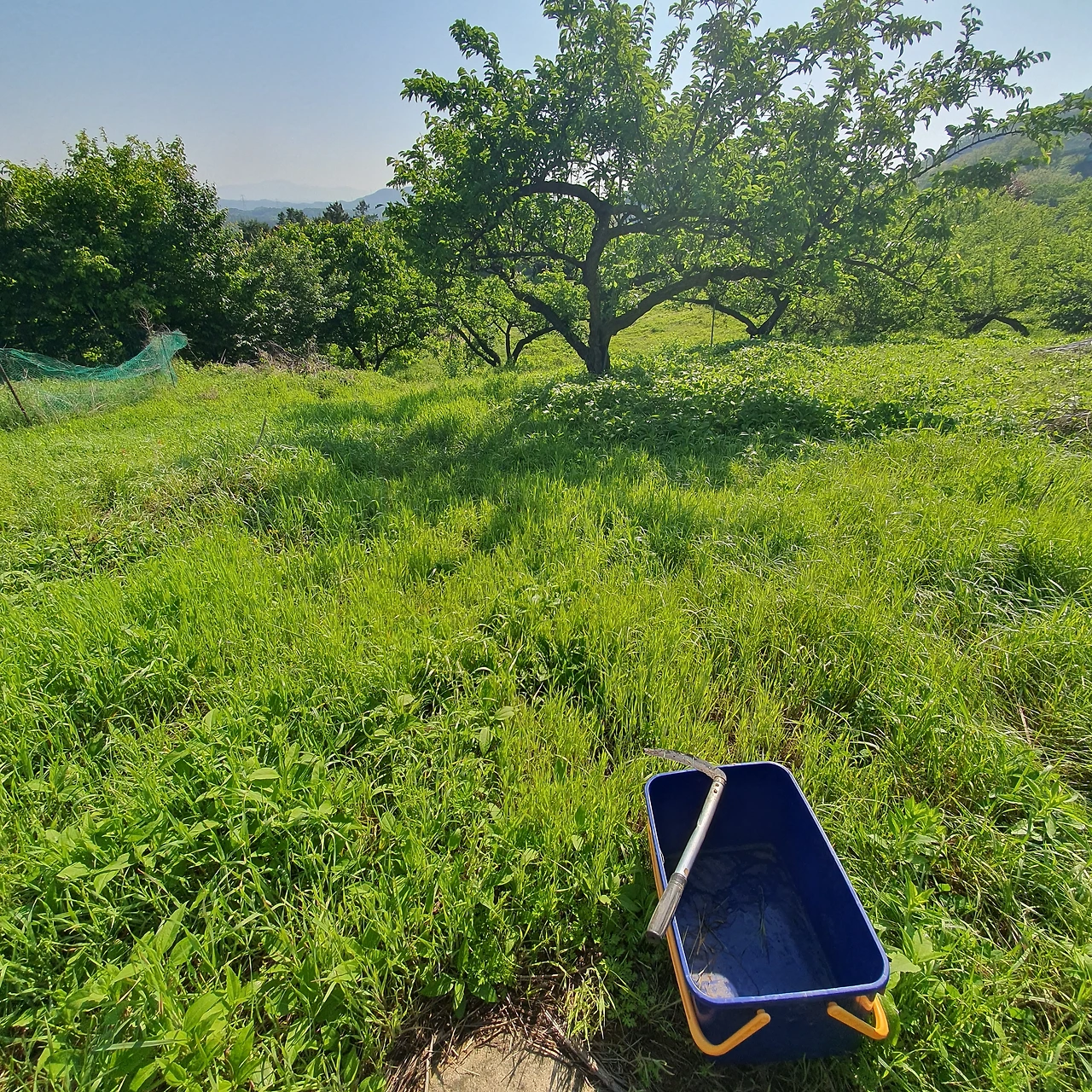 주위 과수원에서 비온 뒤 다들 농약살포와 예초작업을 하시길래 우리도 그래야할 것 같아 낫질을 하며 과수원 풀을 조금 매주었어요. 여보씨는 예초기를 했죠.