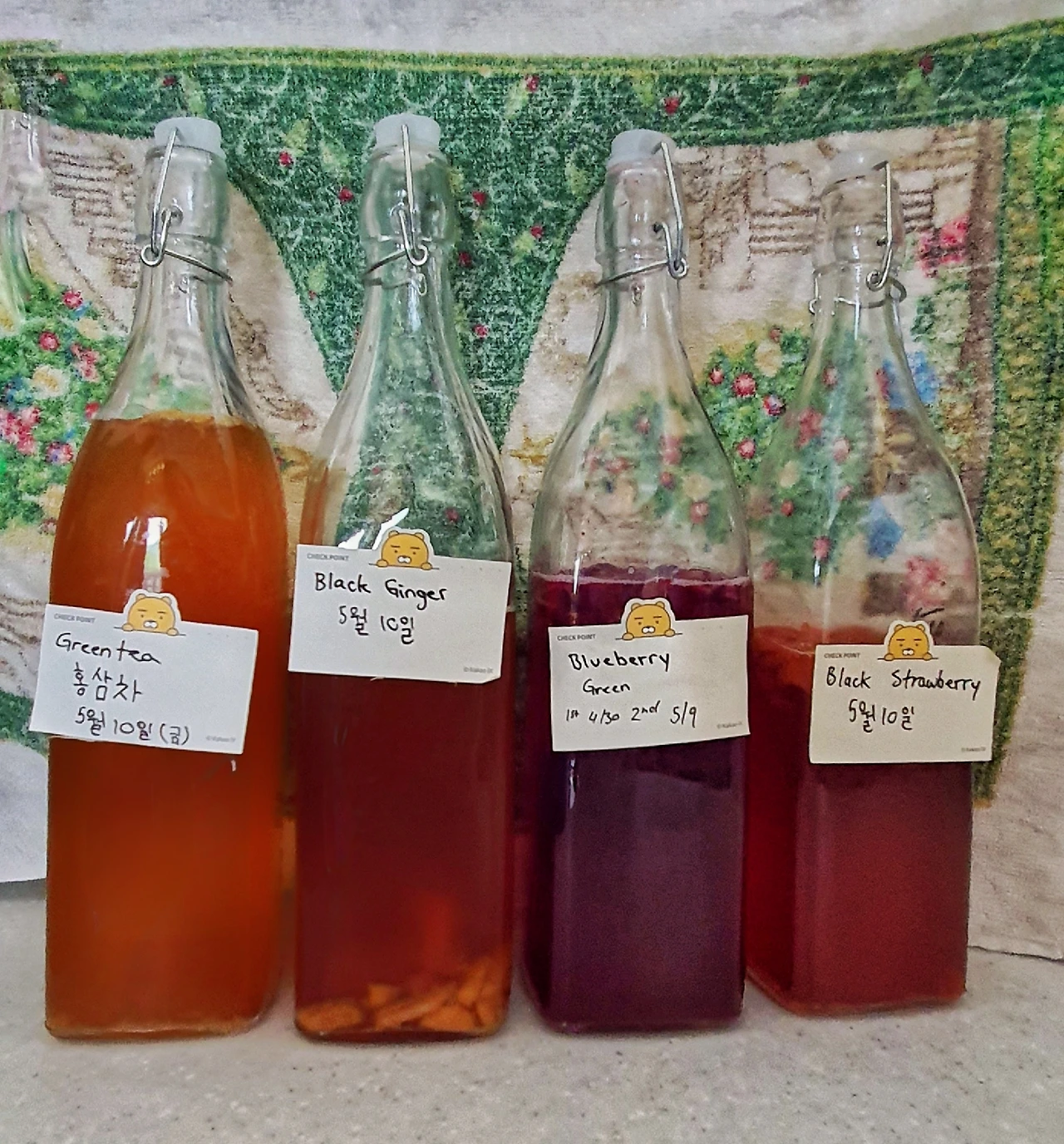 홍삼, 생강, 블루베리, 딸기 이렇게 4가지 콤부차가 만들어졌습니다. 예상 밖으로 저는 생강콤부차가 참 맛있었어요. 단맛이 제일 덜한 재료라 별로일거라 생각했는데 참 괜찮습니다.