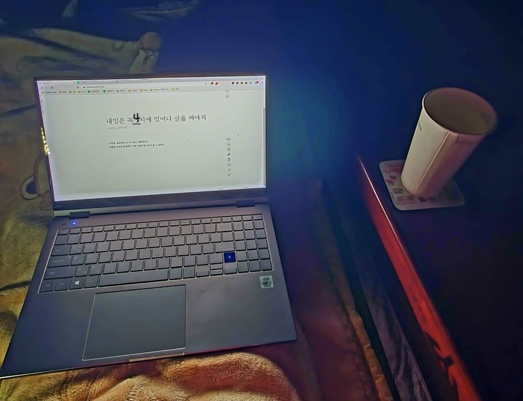 스트레칭을 마치고 따뜻한 물을 한잔들고 나는 노트북 앞에 앉는다. 아 아직도 밖이 깜깜하구나. 글을 쓰는데 정말 제대로 된 새벽이다! 이 얼마나 완벽한 시작인가 흐뭇해 하지만 무엇을 하기에 완벽한 순간이란 게 정말 있는 것일까. 황금새벽을 놓쳤다는 그 생각때문에 글쓰기가 이렇게나 미뤄진 거면서.