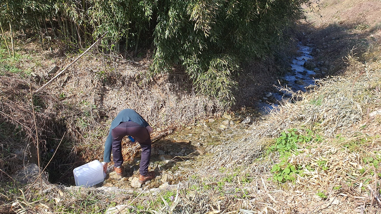 비가 와서 계곡물이 넘쳐요. 물 받으러 가는 여보씨