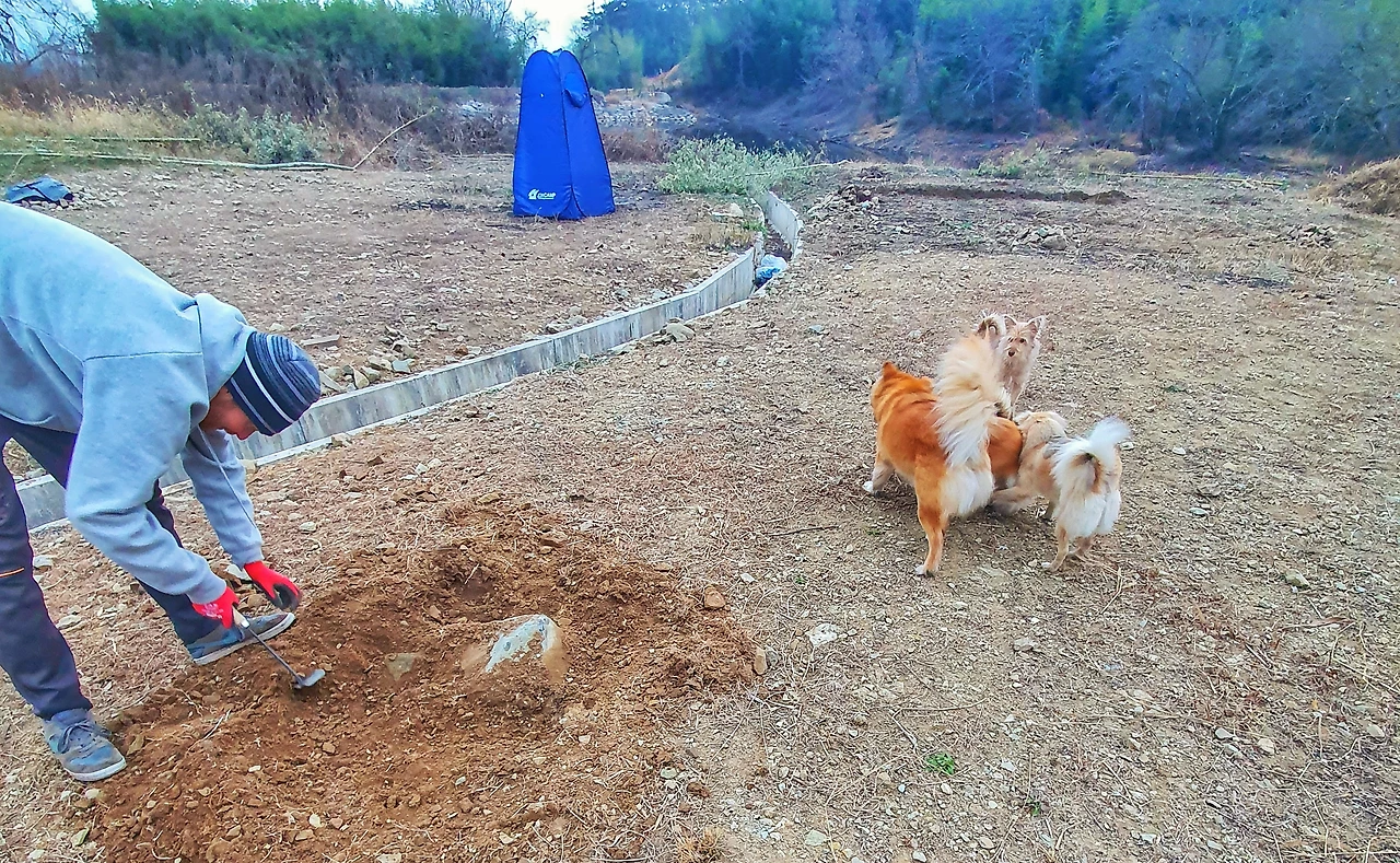 밭에 큰 돌을 듬성듬성, 강아지들 쉬야석