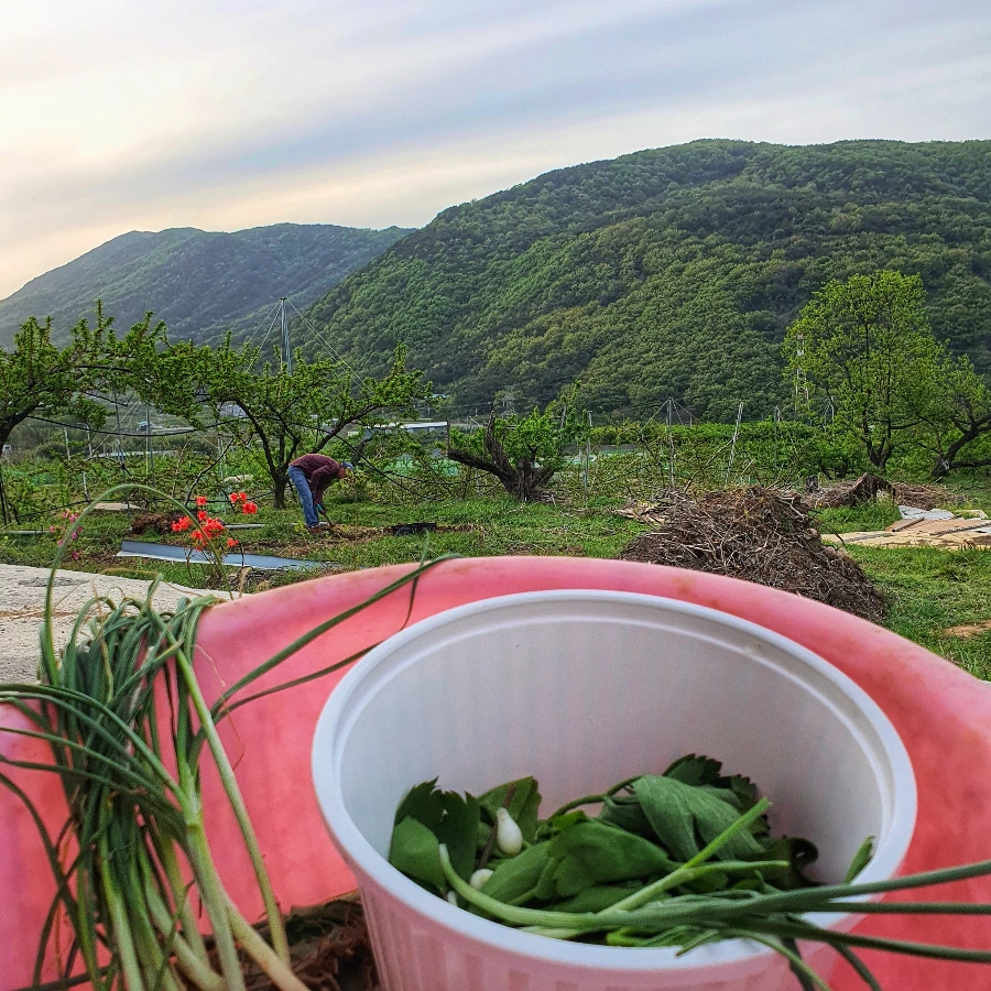 해질무렵이면 여보씨는 텃밭 일굴 땅을 정리하고 저는 저녁거리를 따와 다듬어요. 달래와 방풍나물이 아주 많이 자라고 있습니다.