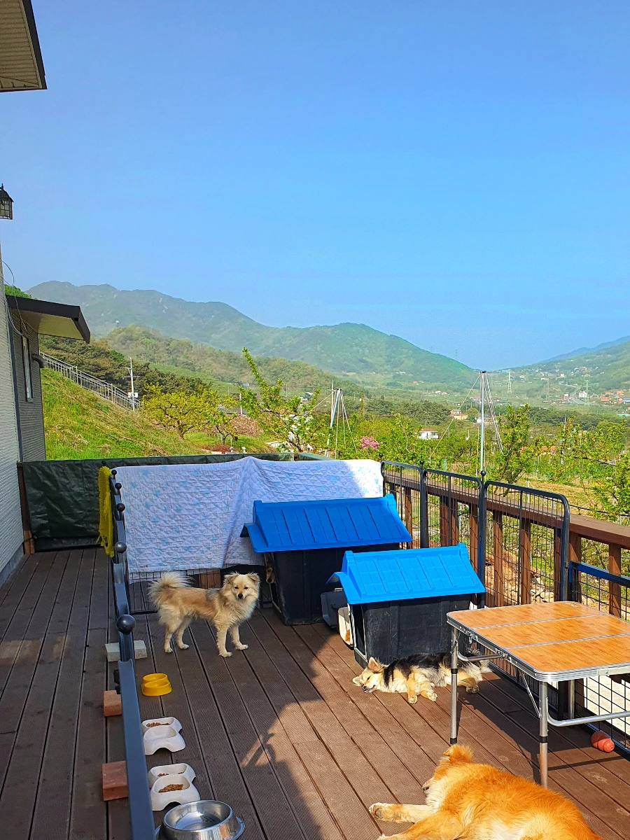 새벽 댓바람부터 강아지들 산책을 다녀오면 해가 더워지기 전까지 아침 밭일을 할 수가 있습니다. 아직까지는 아침기운이 쌀쌀해 강아지들이 햇빛에 누워 다시 잠을 청하죠.