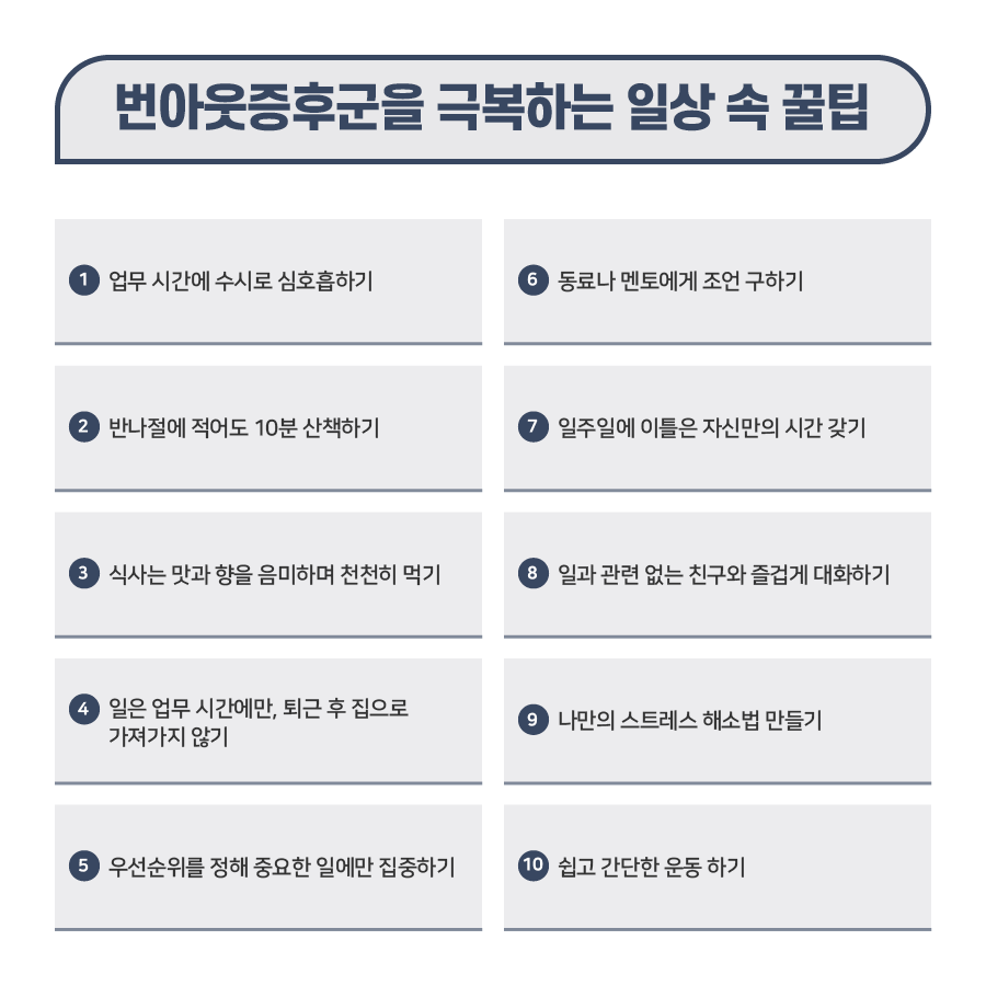 지속적인 스트레스는 번아웃 증후군을 유발하며, 세계보건기구에서 건강상태에 영향을 끼칠 수 있는 위험요소라고 발표한 만큼 극복하는 방법에 대해 알고 스스로를 챙기려는 노력이 필요하다.