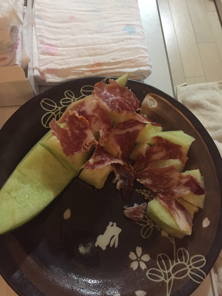 아무리 태어난지 한달도 안된 신생아가 있는 집이라 해도 마지막 날 나름의 의식을 하고 싶었다. 그래서 남편이 춘이와 씨름할 동안, 스페인 여행을 떠났던 친구에게 부탁해 받은 하몽을 개봉하자 하곤, 큰맘먹고 산 메론을 정성스럽게 잘라 한땀한땀 하몽을 올려두었다.