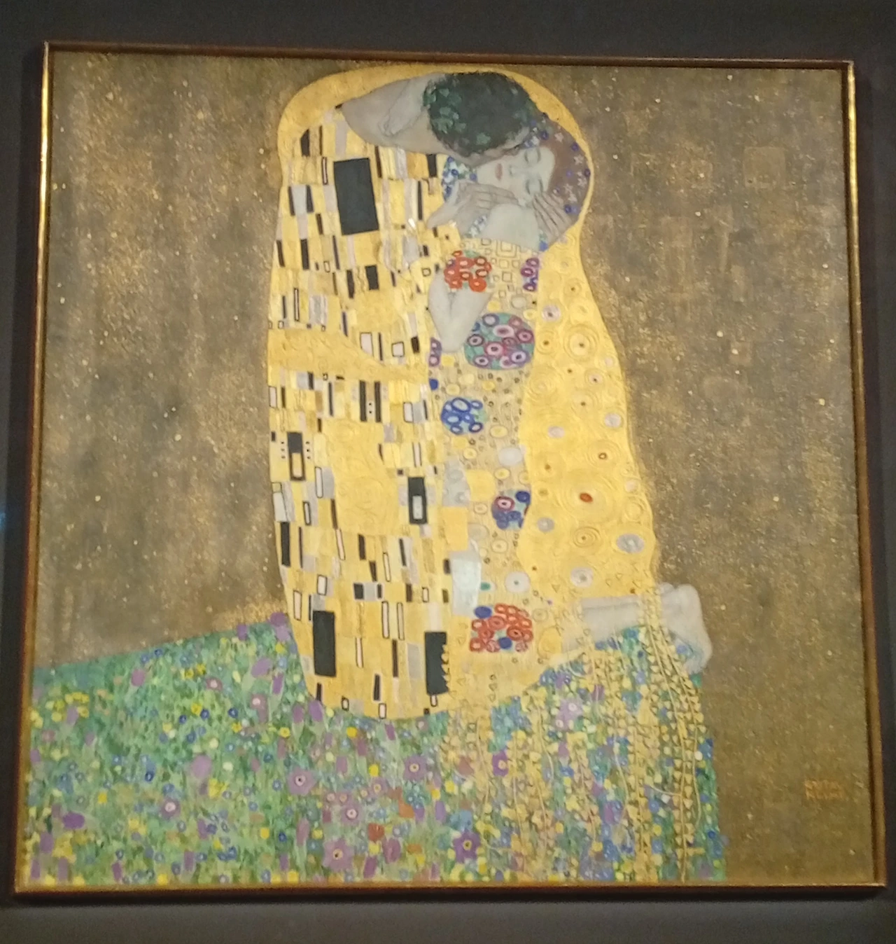 그런데 아래 작품 속에는 가시적인 에로스는 없다. 클림트의 수많은 다른 그림들과는 달리 두 주인공의 몸은 옷으로 꽁꽁 감싸여 있다. 게다가 남자의 얼굴은 보이지 않는다. 그림을 구석구석 자세히 들여다보면 다소 우습고 황당할 수도 있는 현실적 요소도 있다.