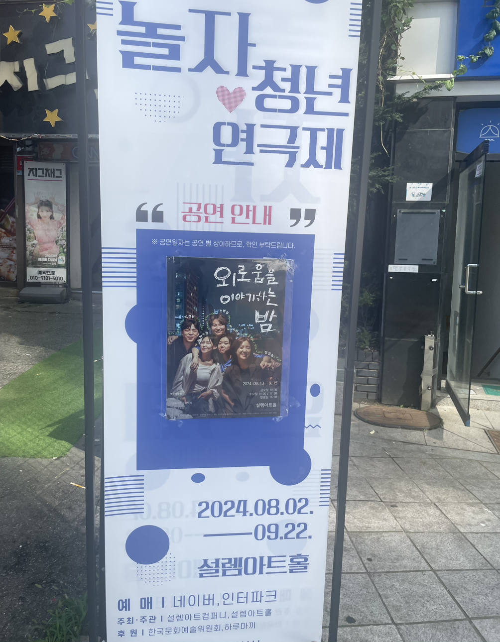 무대 배경이 술집인데다가 등장 인물들이 계속 술을 마시는 장면이 나와서 그랬는지, 아니면 "외로움"이 주제여서 그랬는지 연극을 보는 내내 술 한 잔이 생각났다. 만약에 술을 마시면서 이 연극을 보았더라면, 등장인물들의 말 한 마디 한 마디에 더 깊이 몰입하면서 나의 내면에, 아니 정확히는 무의식속에 잠재하고 있는 "외로움"을 좀 더 깊이 들여다 볼 수 있었을까. 우연의 일치일지는 몰라도 "외로움"이 주제였던 공연이라 그런지 이 날 공연을 왔던 관객중에 절반 이상이 나처럼 혼자 방문한 관객이었다. 서두에서 언급했듯이 관객의 수는 그리 많지 않았지만, 오히려 적은 관객수가 이 공연의 성격과 더 잘 맞다는 생각이 들었다.