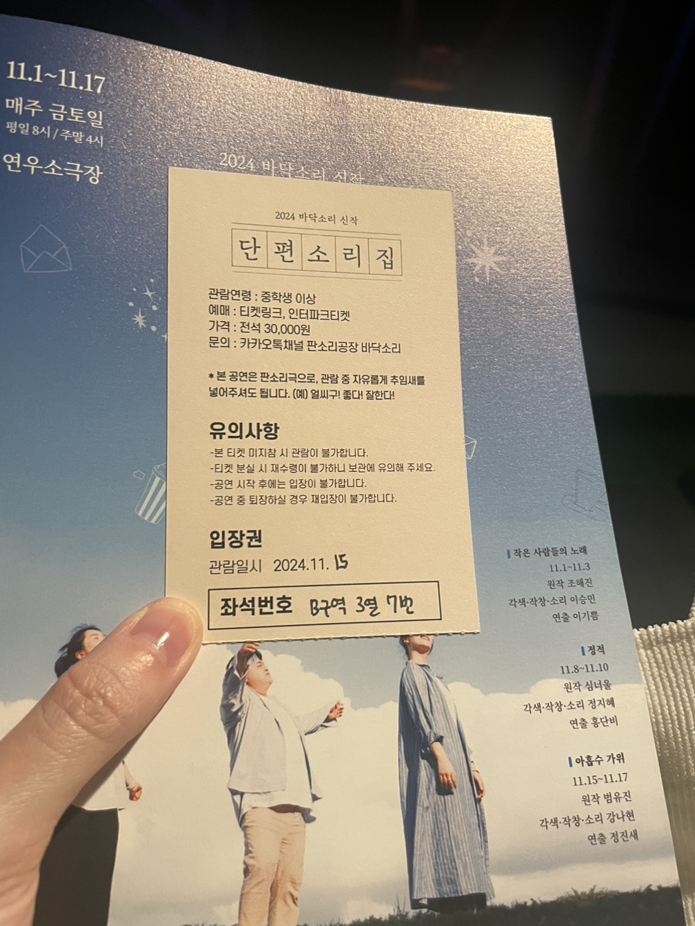 필자가 관람한 공연은 창작 판소리 <아홉수 가위>였다. (11월 15일, 연우소극장) <아홉수 가위>는 범유진 작가의 소설 <아홉수 가위>를 판소리 형식으로 재구성하여 풀어낸 작품이다. 한국 문화에서 "아홉수"와 "가위"는 다소 불길한 의미를 가지고 있다. "아홉수"라는 미신은 인생에서 가급적 피해야 하는 것, 그리고 "가위" 역시 "가위눌림"의 줄임말로 심리적 불안과 불행의 의미를 담고 있다. 창작 판소리 <아홉수 가위>는 한국에 오랫동안 만연되었던 미신 문화를 바탕으로 현재를 살아가고 있는 청년 세대들의 불안과 분노, 소외감을 다루었다. 29세의 주인공은 매번 꼬여가는 자신의 인생에 비관하여 삶을 마무리하기로 결정하고 아무도 살지 않는 옛 할머니의 집에 가게 된다. 그녀는 할머니의 집에서 살면서 매일매일 가위눌림을 당하지만 크게 개의치 않는다. 그렇게 며칠을 할머니 집에서 보내다가 아무도 없는줄 알았던 할머니 집에 지박령 귀신이 살고 있다는 사실을 알게 되고 귀신과 기묘한 동거를 하게 되는 주인공. 귀신과 주인공은 끊임없는 대화를 통해 서로를 탐색하게 되고, 서로의 연약함을 알아가면서 차츰차츰 마음의 문을 열게 된다. 귀신과 친해지고 귀신으로부터 위로를 얻는 과정에서 주인공은 죽음이 아닌 다시 살아갈 용기를 얻게 된다.