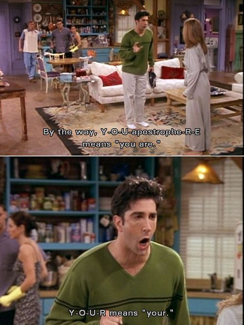 맞춤법은 우리나라 사람들에게만 어려운 게 아니다. 특히 발음이 거의 동일할 때 생기는 오류는 세계 어디에나 있다. 영어권 국가 원어민들이 말도 안 되게 자주 틀리는 단어가 하나 있다. 바로 you’re(너는)과 your(너의)이다. 영어가 제 2외국어인 우리의 눈에는 너무나도 명확하고 전혀 다르게 보이는 이 둘을 왜 그리도 헷갈려 해서 종종 반대로 쓰는지 아직도 이해불가다. 특히 유튜브 댓글에서 “you’re music makes me elevated.”, “your the best.”라는 문장을 심심찮게 볼 수 있다. 오죽했으면 미드 프렌즈에서도 레이첼이 쓴 편지를 읽은 로스가 이 부분을 지적했을까.