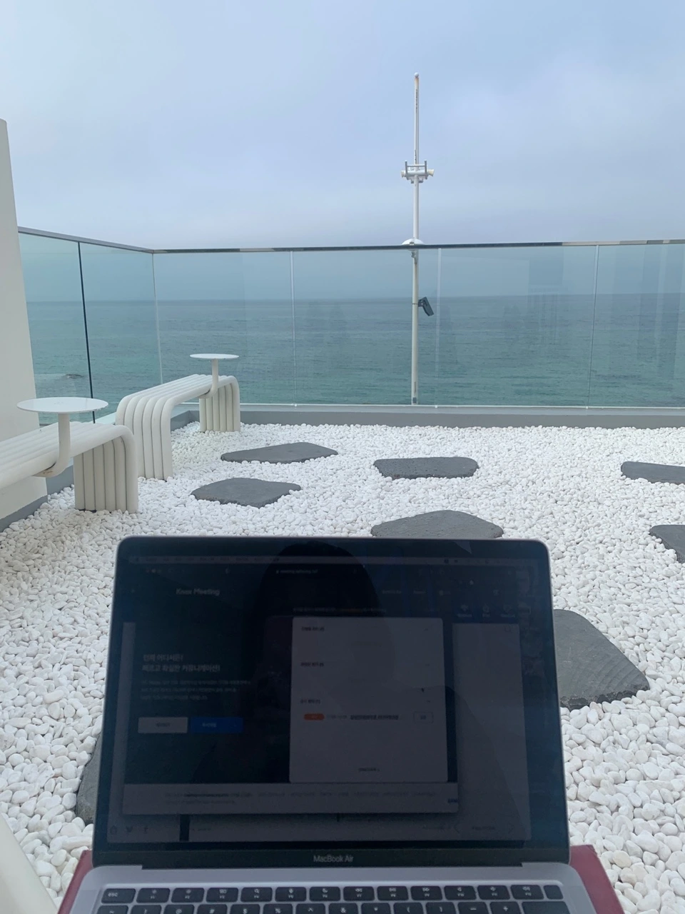 다음 날 오후, 이렇게 뻥 뚫린 바다를 바라보며 화상 수업을 했다. 사무실에서 수업을 듣는 학생들에 비해 바닷바람에 흩날리는 머리카락으로 수업하는 내 모습을 화면으로 보고 있기가 조금 민망했지만 달리 방법이 없지 않은가! 이런 전망이 코 앞에 있다면 활용할 수 밖에.