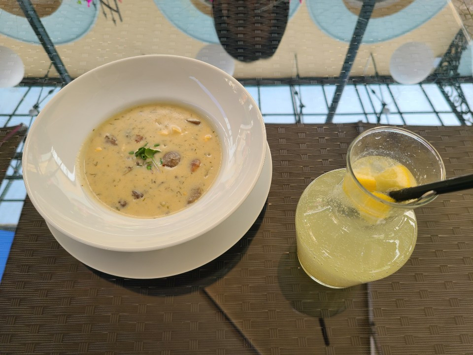 메뉴는 런치 메뉴가 있어서, 식전 수프와 연어, 바질 파스타, 레몬 에이드를 시켰습니다. 수프가 너무~ 맛있어서 먹자마자 바로 1개 더 주문했습니다.