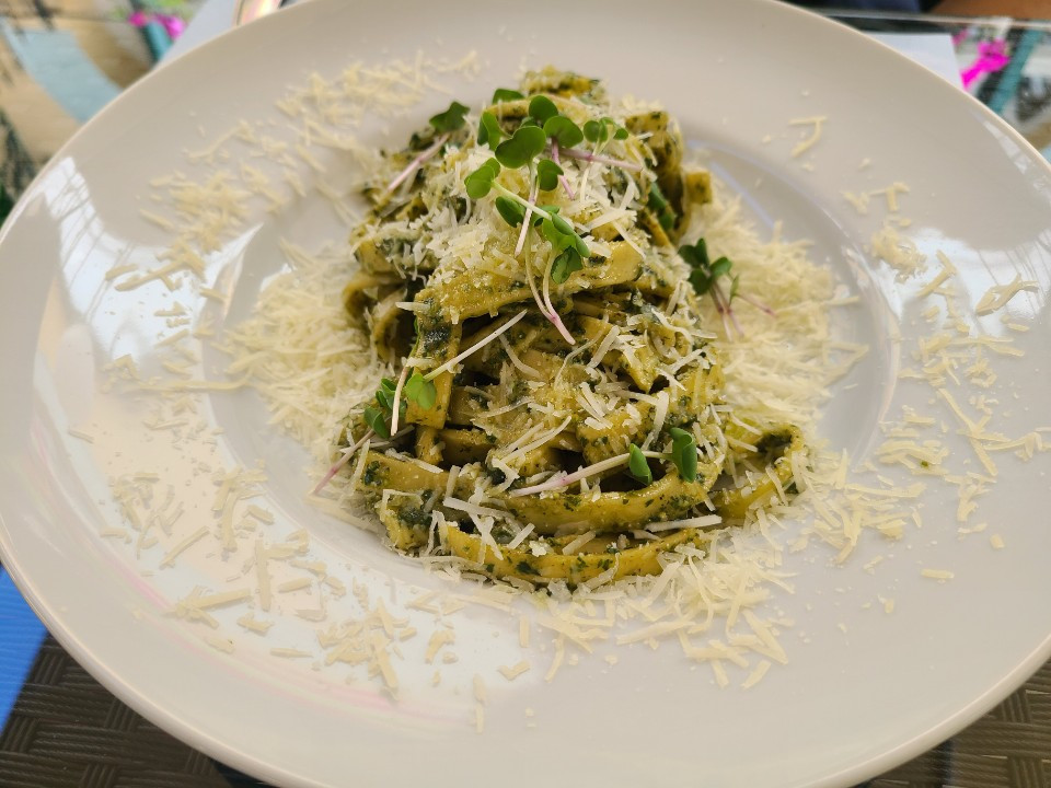 그리고 이어서 나온 바질 파스타! 바질 파스타는 조금 아쉬웠어요.파스타 면이 굵었는데, 다른 면을 썼으면 더 맛있었을 거 같아요! 그리고 면도 너무 익어서 식감이 면이 퍽퍽 끊기는 맛이 났습니다. 요즘에 한국에도 맛있는 파스타 집이 너무 많아서 입이 고급져졌는지, 이 곳에서의 파스타가 특별하게 느껴지진 않았습니다.