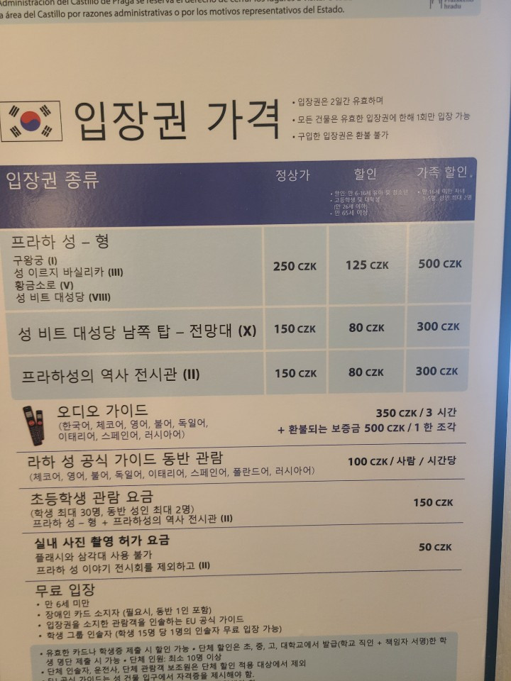 입장권은 당일도 줄 서지 않고 살 수 있었습니다. 무엇보다 일요일인데도 문을 열어서 좋더라고요 ㅎㅎ 한국인도 많이 오는지, 매표소에 가면 이렇게 한국어로도 안내가 잘 되어있었습니다. 전망대 표는 올라가기 전에 직접 구매가 가능하다고 해서, 프라하성 입장권과 오디오 가이드 1개를 빌렸습니다.