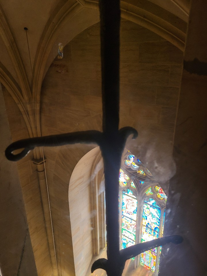1층에서 전망대 비용 인당 150 코루나를 지불하고, 한 4분의 1? 올라가다 한 컷 찍었습니다. 계단이 원형으로 쭉 이어져서 더 힘들게 느껴졌지만 아래 올라오시는 분들께 양보도 많이 하고 응원도 받으면서 결국 올랐습니다!