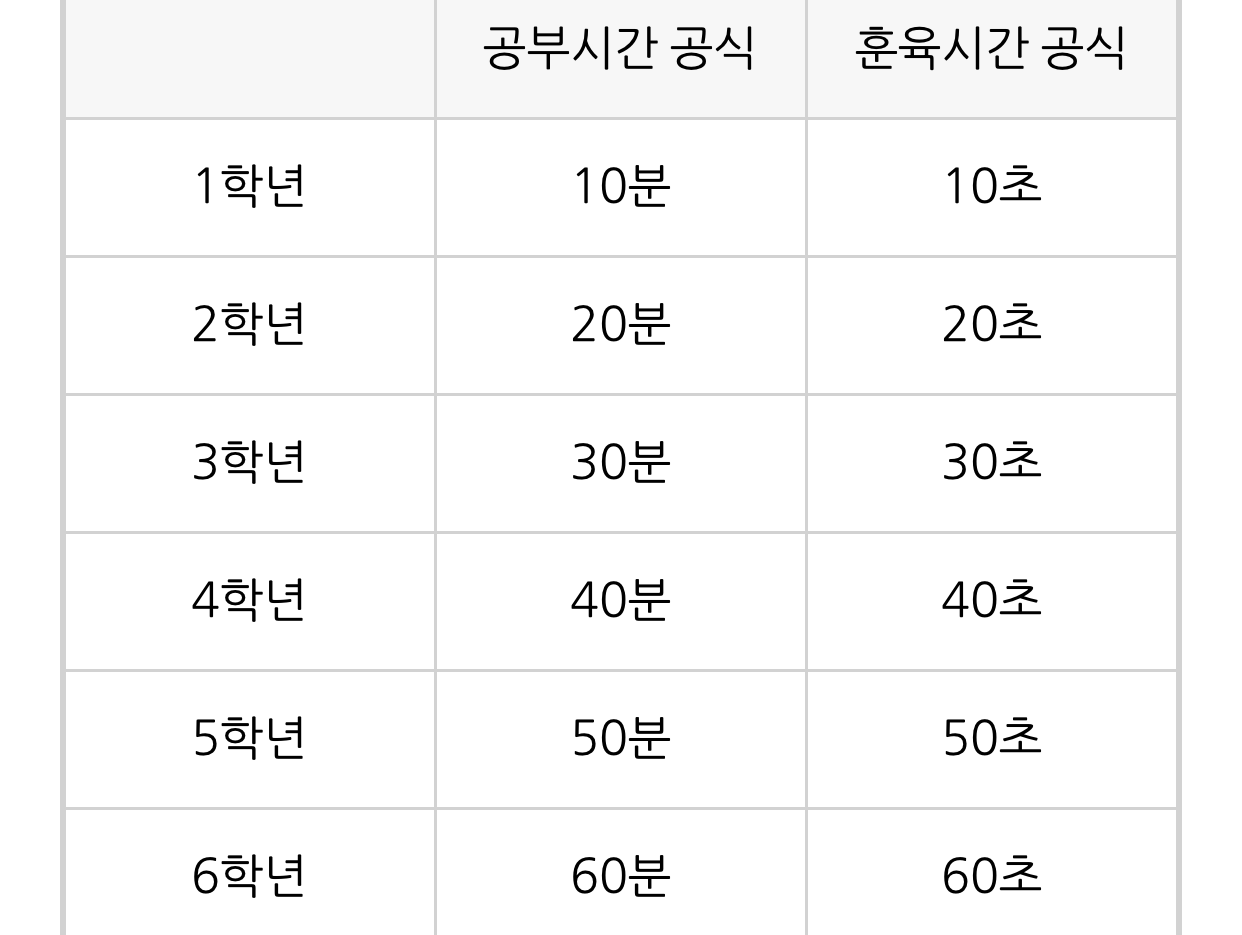 공부시간은 학년에 분을 붙이고, 훈육시간은 초를 붙이니 거의 맞아 떨어지더라구요.