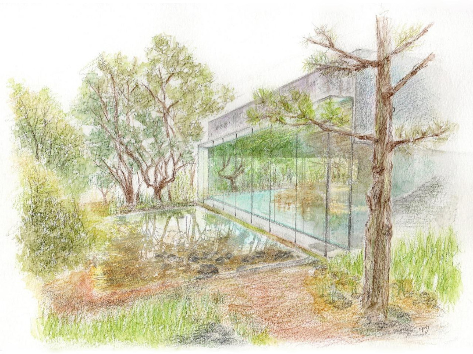 초록빛 싱그러운 나무와 잎사귀, 온갖 풀잎들로 둘러싼 티스톤 건물의 창은 투명했고 작은 연못은 밝게 빛나고 있었다.