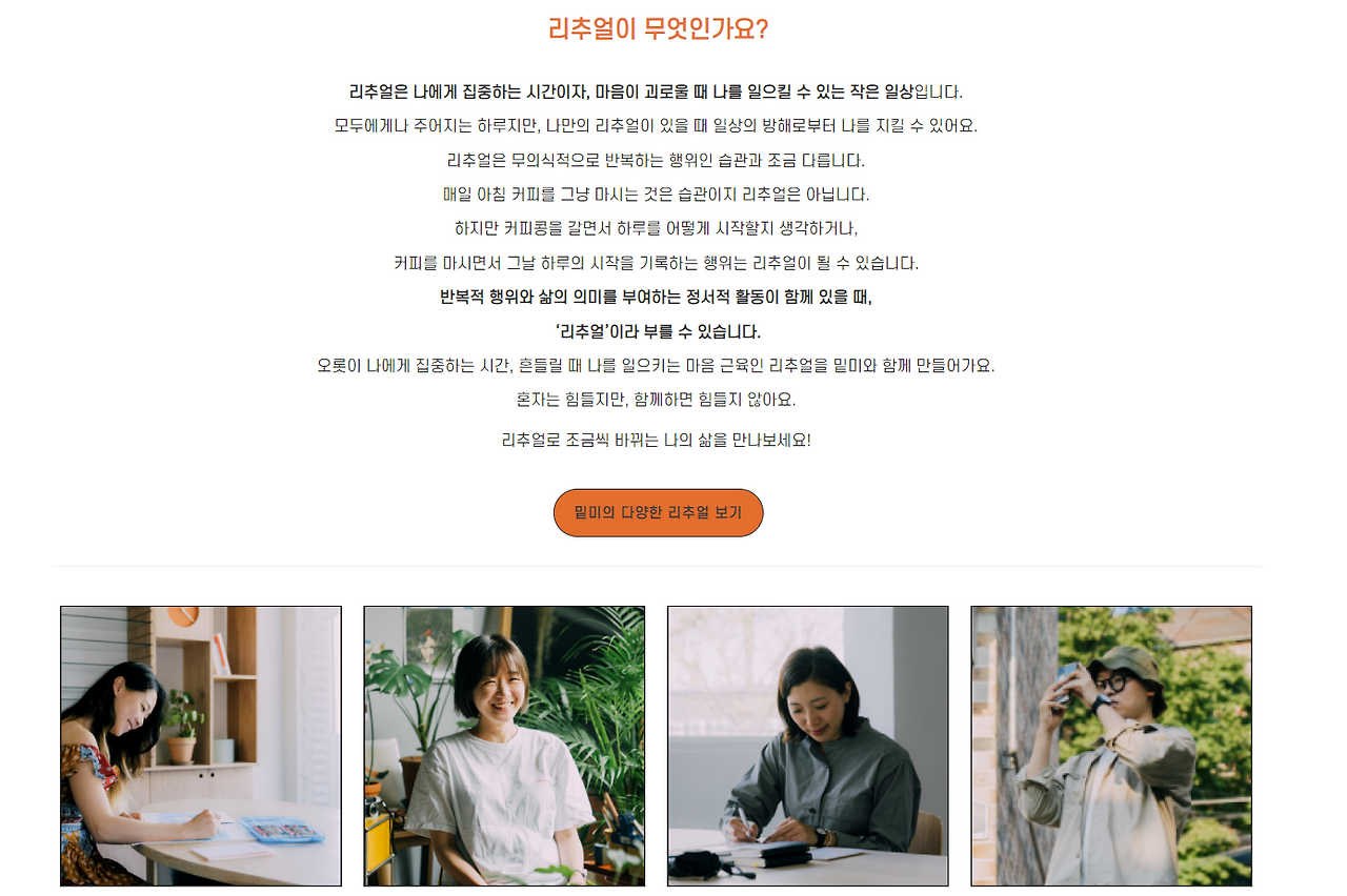 최근에 자아성장 큐레이션 플랫폼 밑미홈의 오프라인 공간에 다녀온적이 있다. 밑미홈은 ‘리추얼’이라는 개념을 중심으로 다양한 ‘프로그램'을 운영하고 있는데, 오프라인에서 다양한 리추얼의 사례를 전시하면서 관련 용품, 책 등을 판매하고 있었다.