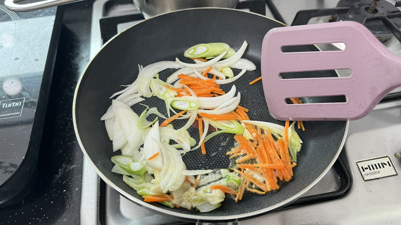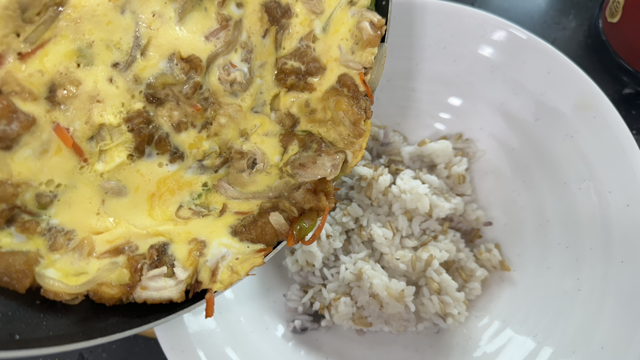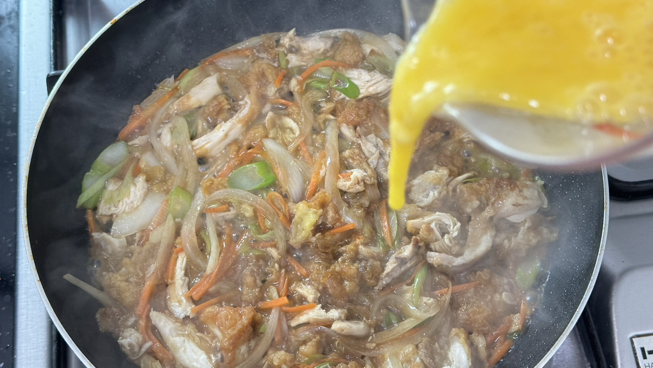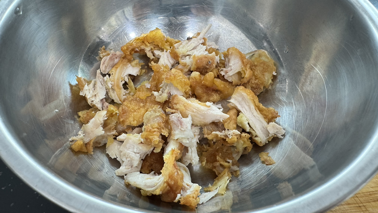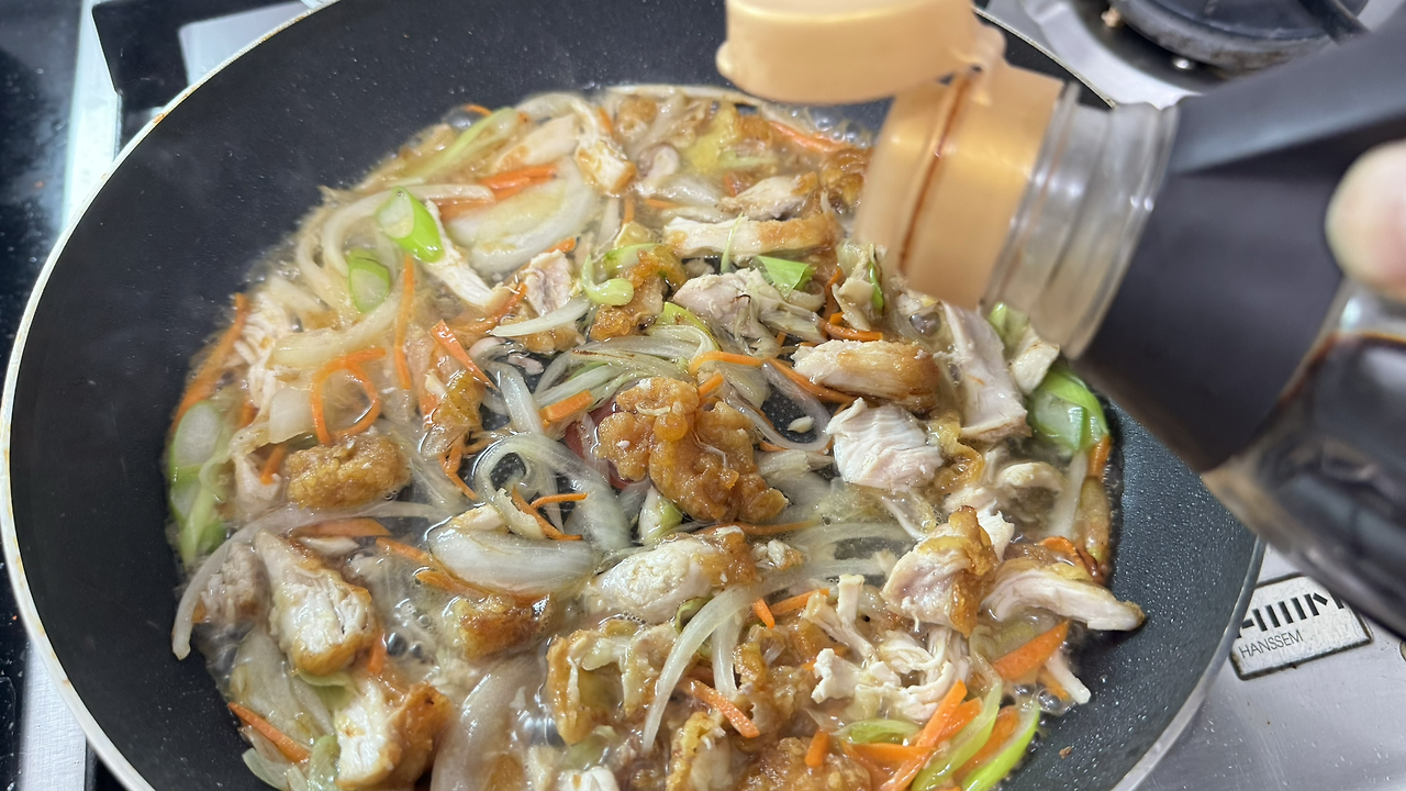 채소를 볶다가 잘게 찢은 치킨도 넣어 볶고