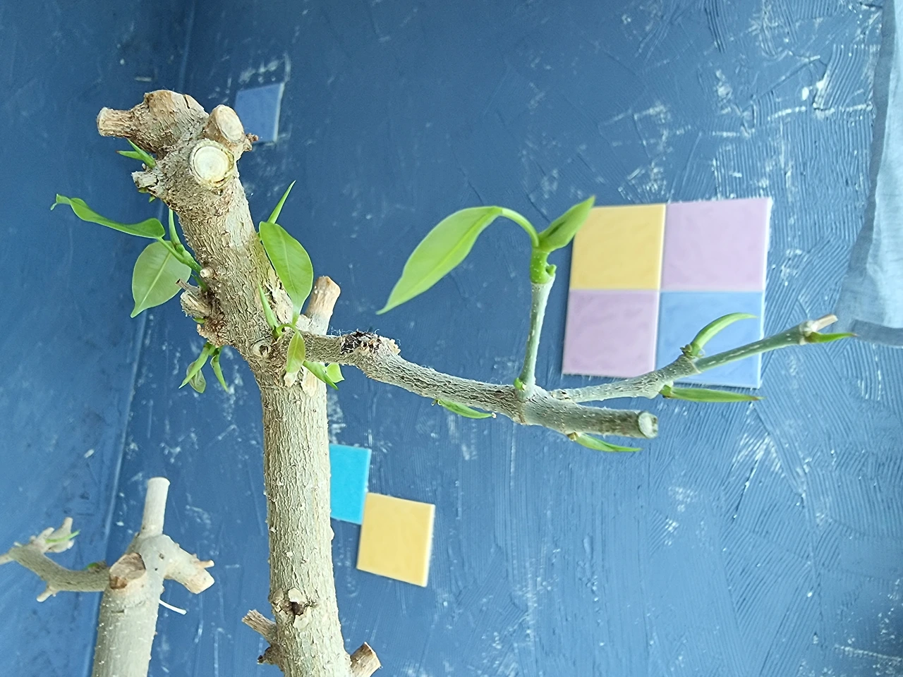 그러던 어느날 아주아주 작은 점 같은 것이 하나 봉긋 솟아나기 시작했다. 초록색이었다. 어? 살아나나? 그렇게 시작된 초록점이 물결(!)이 되어 가지 곳곳으로 퍼져 나갔다. 점 하나였던 것이 이제는 이제는 제법 잎의 모양을 갖춘 것도 생기고 그 잎이 쭉쭉 밀고 나와서 가지가 될 법한 녀석도 생겨났다. 다른 곳에서는 또다른 점이 막 생겨나고 있었다.
