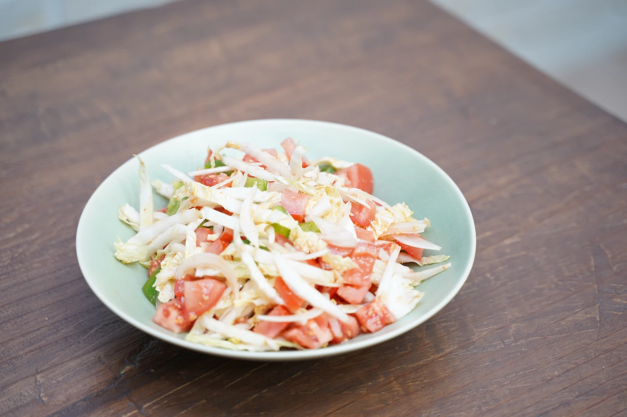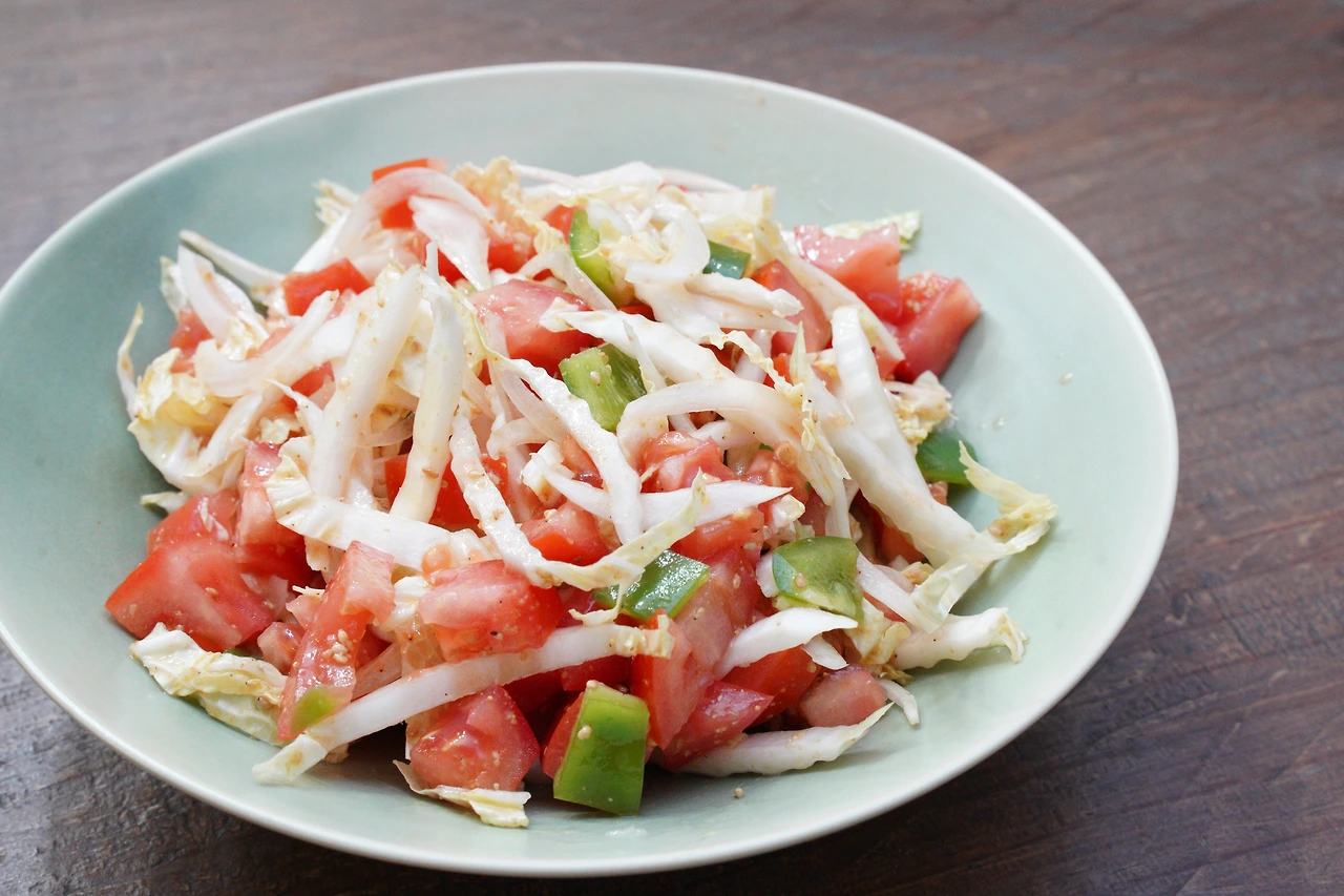 재료는 토마토, 배추, 피망, 양파, 올리브오일, 소금, 통깨, 후추, 식초. 만드는 법은 간단하다. 토마토는 작은 크기로 깍둑썰기를 한다. 배추는 결의 직각 방향으로 잘게 썰어준다. 피망은 반으로 갈라 씨를 버리고 엄지손톱만 한 크기로 네모로 썬다. 양파는 얇게 슬라이스 해서 찬물에 담갔다가 건진다. 이 모든 재료를 믹싱볼에 넣는다. 그런 다음 올리브오일 듬뿍, 소금 반 찻술, 식초 한 찻술, 후추 약간, 절구에 간 통깨 한 큰술을 넣는다. 숟가락 두 개로 아래쪽에서부터 위로 뒤집어 주면서 잘 섞는다. 그라나 파다노 치즈나 파르미지아노 레지아노 치즈가 있으면 갈아서 올린다. 발사믹 식초는 안 넣어도 된다. 올리브오일과 소금만으로도 충분히 맛있다. 게다가 고소한 통깨까지 갈아 넣었으니.