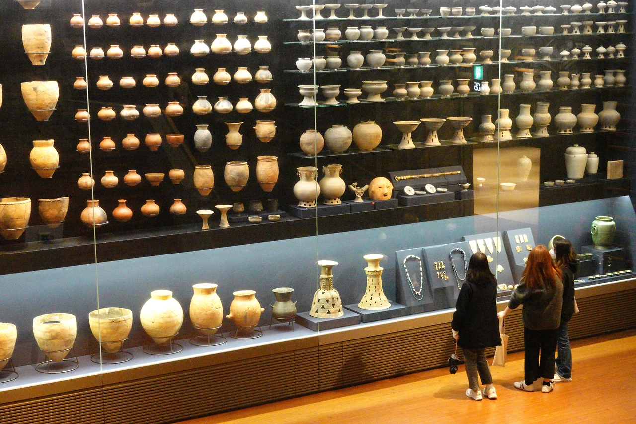 그리고 무엇보다 내 맘에 쏙 들었던 것은 마지막 방이었다. 출구 직전에 있는 방에서는 커다란 벽면 전체에 선사시대부터 조선시대까지 만들어진 토기와 자기들을 전시하고 있었는데 개별 유물에 대한 설명보다는 수천년의 세월이 축적된 그릇들을 담담하고 대담하게 보여주면서 그 자체의 아름다움을 느끼도록 해주었다. 특별한 설명을 달지 않고 여기서부터 저기까지는 선사시대, 그 다음부터는 삼국시대, 그리고 저 끝은 조선시대 정도로만 구획을 나눠놓고 그저 그냥 감상하고 느낄 수 있게 해주었다. 가르치려 들지도 않았고 어려운 말들도 없어 좋았다. 멀리 또는 가까이에서 보기만 하면 될 뿐이었다.