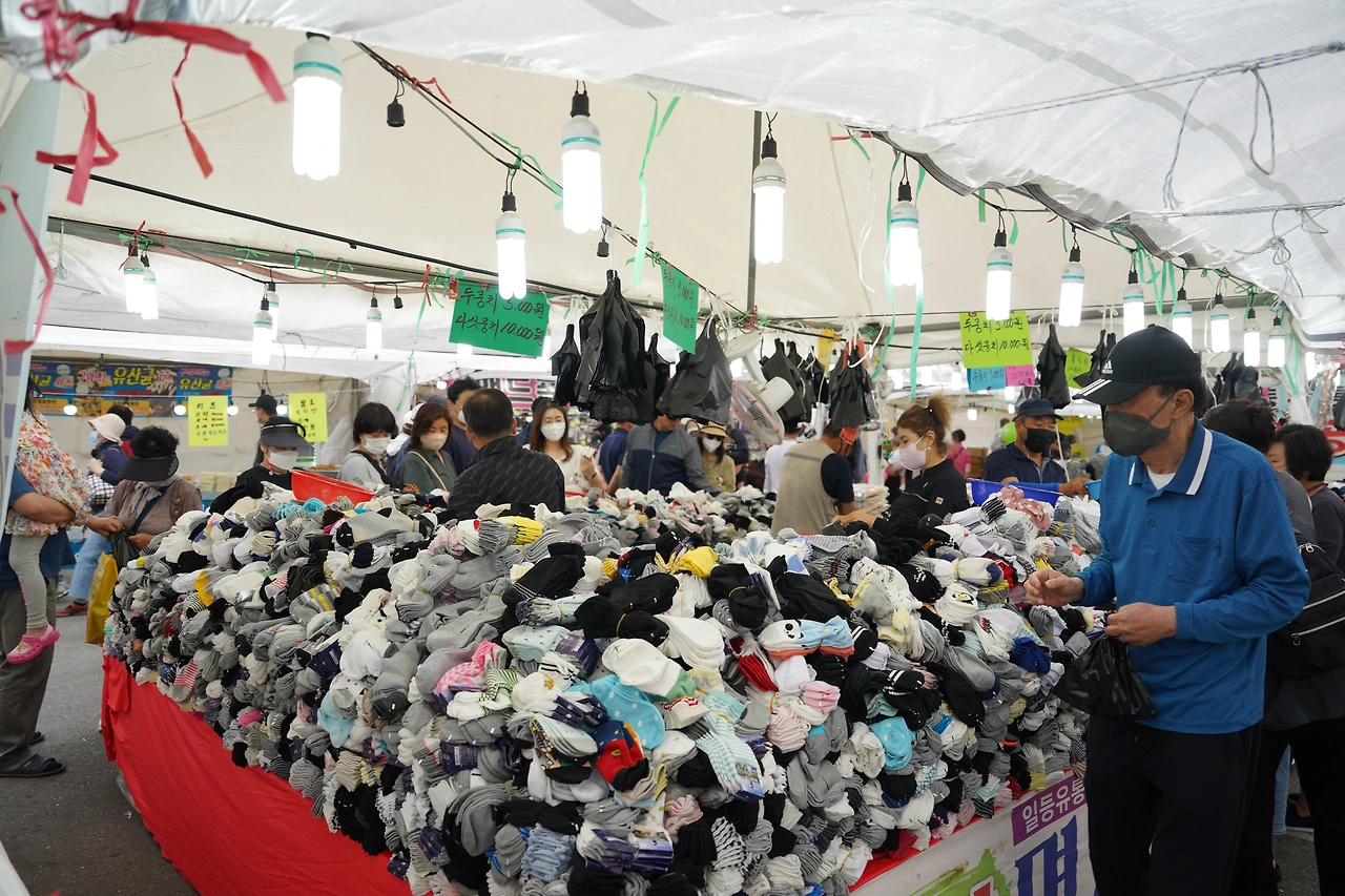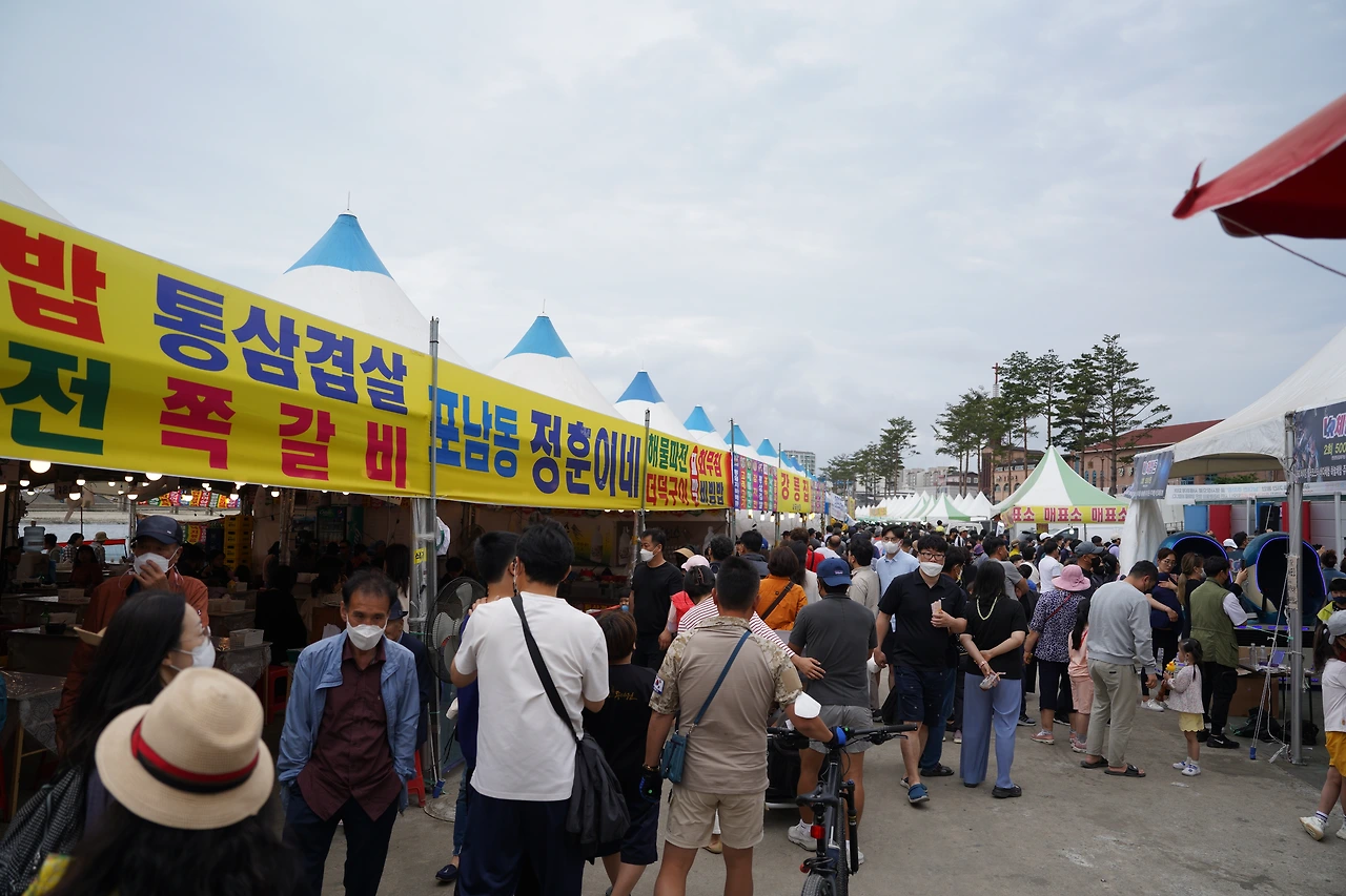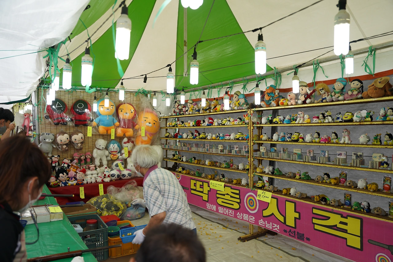 펄럭이는 깃발은 그곳의 풍경에 대한 뚜렷한 암시였다. 제방에 올라서자마자 남대천이 한 눈에 들어왔고 천변 양쪽에는 하얀 천막들이 끝도 없이 이어져 있었다. 팔도의 장똘뱅이들이 다 모였다. 사회적 거리두기로 몸을 사리고 있던 사람들이 다 강릉에 왔다. 바야흐로 코로나의 끝이구나. 하늘에 떠 있는 촌스런 애드벌룬이 그렇게 반가울 수가. 사람들은 이렇게 미친듯이 사람들을 만나고 싶었구나. 나는 나랏님도 아니면서 축제장에 몰려든 백성들을 보면서 뭉클했다. 우연히(혹은 치밀한 계획에 따라) 축제장을 방문한 나랏님이 들뜬 백성들의 얼굴과 산뜻한 발걸음을 보면서 감격의 눈물을 흘리는 장면을 연출해서 선전하면 어떨까. 너무 북한스러운가. 60~70년대 느낌인가. 상상은 자유이므로 머릿속으로 잠시 구성, 촬영, 편집, 상영을 단박에 끝냈다. TV를 너무 많이 봤다.