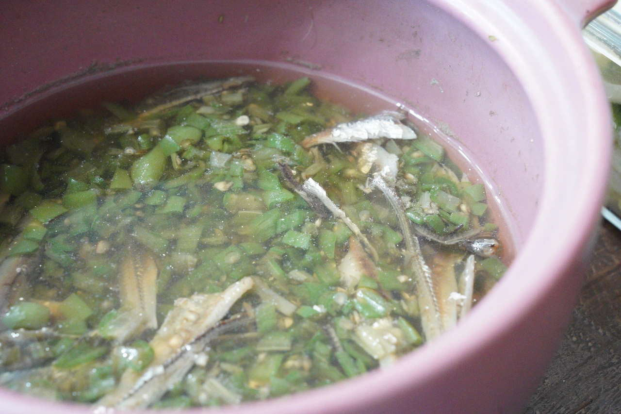 마지막 반찬은 경상도식 반찬인 고추장물이다. 이 반찬을 만들 때마다 할머니를 떠올리지 않을 수 없다. 뜨거운 여름 입맛이 똑 떨어지고 뜨거운 음식을 물리고 싶을 때 할머니가 만든 이 고추장물이 가족들을 구원했기 때문이다. 굵고 두꺼워서 찍어먹기도 부담스러운 고추를 고른다. 매운고추 반 풋고추 반이다. 길이 방향으로 반으로 가른 다음 다시 길게 자르고 잘게 다진다. 냄비에 자박하게 물을 붓고 다진 고추, 국물용 멸치, 조선간장을 넣고 바특하게 조린다. 조금 짜도 상관없다. 이용법은 이렇다. 찬물에 맨밥 말아 먹을 때 밥 한 술, 고추장물 반 술 정도 입에 넣는다. 더 좋은 방법이 있다. 보통 찐 호박잎을 먹을 때 강된장을 많이 먹는다. 고추장물이 강된장의 자리를 대신한다. 푹 쪄서 부드러워진 호박잎을 펴서 손에 올리고 밥 한 술을 얹은 다음 그 위에 고추장물을 다진 고추를 포함해서 끼얹는다. 호박잎의 사방을 잘 그러모아서 쌈을 만들어 먹는다. 까슬까슬한 호박잎의 잔가시들이 입천장을 놀라게 했다가 이내 호박잎이 터지면서 감칠맛과 알싸하게 매운맛이 밥 속에서 퍼졌다가 입 전체를 뒤덮는다. 씹을수록 고소하고 향긋하다는 말을 실감하게 될 것이다. 시골집 마루에서 선풍기 바람을 쐬며 한쪽 다리 세우고 앉아서 양은밥상 앞에서 먹으면 더 잘 어울리는 반찬이자 양념이다.