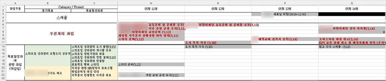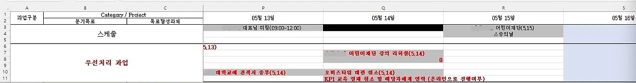 저는 5월15일날 00 어린이재단에서 강의가 있기 때문에 하루 전인 5월14일날에는 그 강의에 대한 준비 리허설을 우선적으로 실시해야 한다고 계획해놓은 것이고 그날 리허설을 끝낸 후에는 해당 셀에 음영 처리를 함으로써 이 업무를 끝냈다고 표시하고 이 일은 제 머릿 속에서 지우는 겁니다.