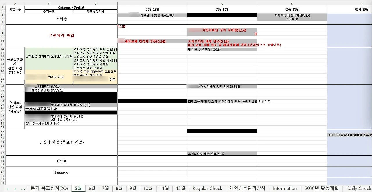 그리고 그 각각의 목표달성과제가 구체적으로 진행되는 과정 가운데서 해야 할 구체적 과업들을 날짜별로 아래 이미지와 같이 기록하고 해당 과업이 종료되면 마찬가지로 해당 셀에 음영처리를 해서 이 업무는 종료되었음을 표시하면서 다음 단계로 해야 할 업무를 그 다음 날짜에 기록하며 종료된 일에 대한 고민은 머리에서 지워버리고 머리를 깔끔하게 정리합니다.