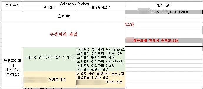 제가 *** 대표님과 스타트업 성과관리 브랜드를 런칭하는 단기 프로젝트를 진행 중인데 그 프로젝트를 성공적으로 런칭하는 것이 2분기 첫번째 목표이고,