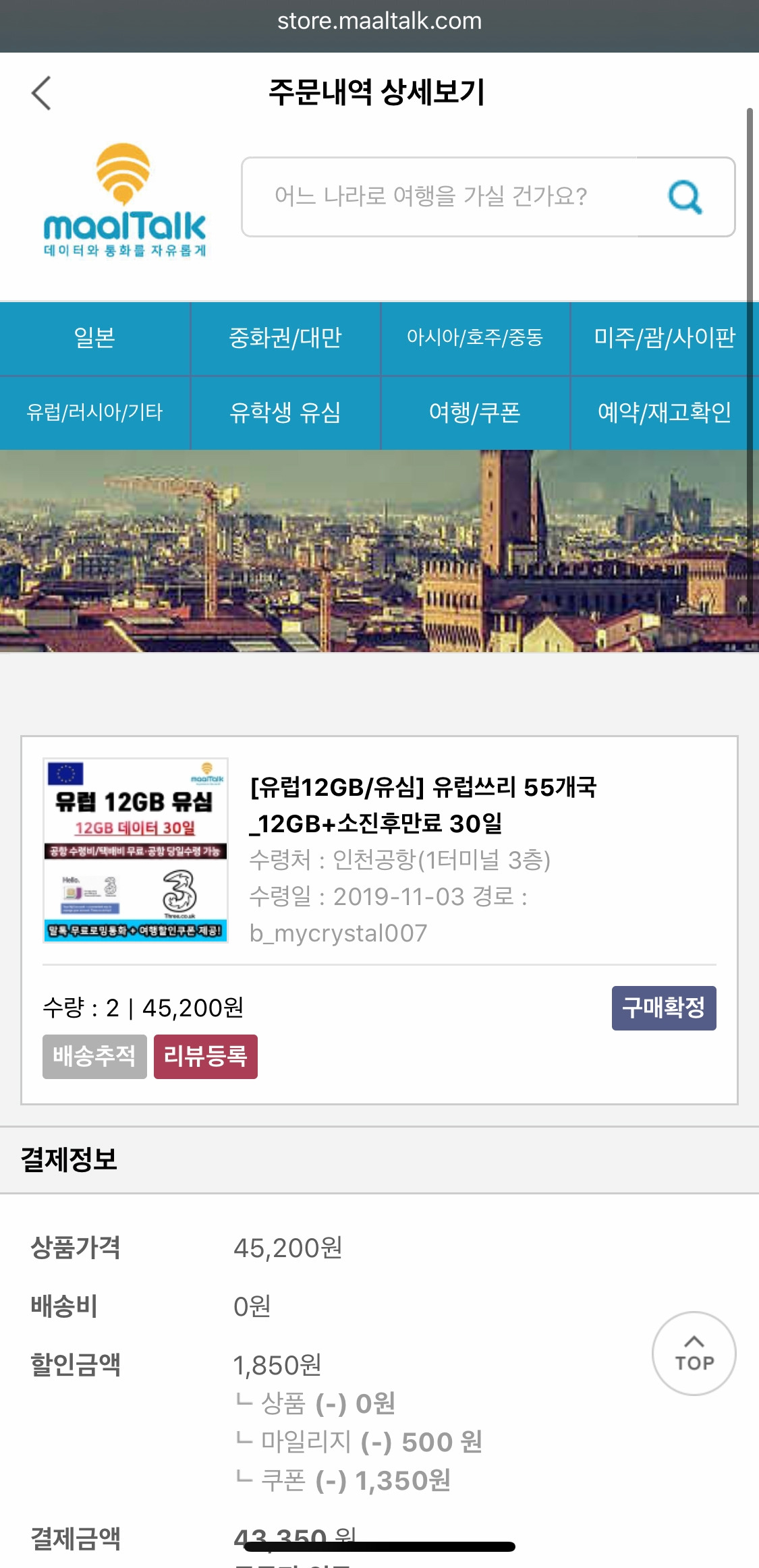 우리 선택은 유럽 55개국에서 사용 가능한 말톡! 12GB라고 쓰여 있지만 영국을 제외한 유럽 54개국에서 사용할 경우 9GB만 사용 가능하다. 우리는 최소한의 것만 결정하고 여행을 떠나는 스타일이라 9GB로 괜찮을까, 하는 걱정이 있었다. L군은 한국에서 한 달에 약 80-90GB를 소비하는 데이터계의 소비 대마왕이기 때문에 구매 직전까지도 망설일 수밖에 없었다. 다행히 비행시간을 제외하고 우리가 유럽에 머문 약 8일 동안 데이터를 사용하고도 데이터가 남았다. 매일 밤 숙소에서 다음 날 일정을 찾고 티켓을 구매하고, 여행하는 시간에는 어디 이동만 하려고 하면 구글 지도를 켰는데도 말이다. 물론 여행 기간 동안 영상을 플레이하는 일을 줄인 데이터 대마왕의 활약이 있기에 가능했을지도 모른다.