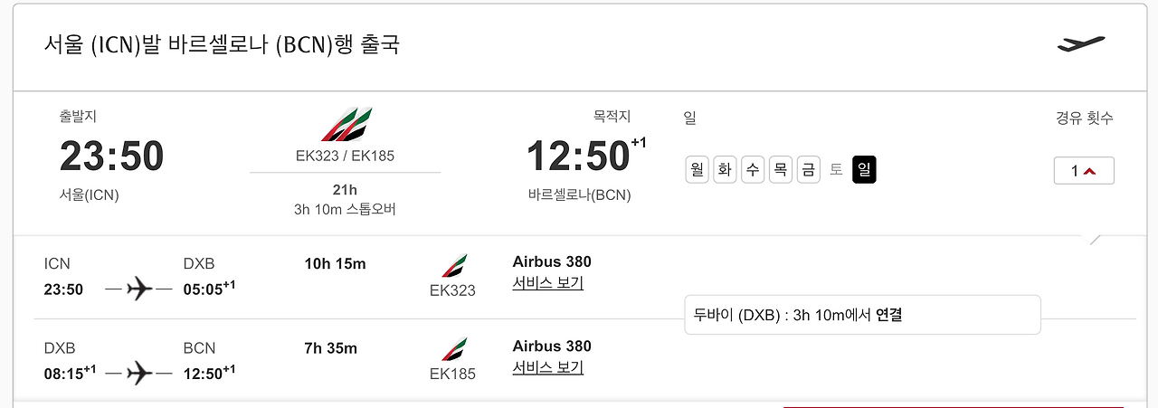 항공권 사이트 옵션을 열어 경유지 1을 더했다. 일요일 밤에 출발할 수 있는 경유 노선은 2개. 에미레이트 항공과 터키 항공. 가격대는 직항의 절반인 1인당 90만 원 후반~100만 원 초반으로 두 항공이 비슷하고 둘 다 경유 시간을 합쳐 총 비행시간이 20시간 정도였다. 단 우리가 원하는 '자면서 이동하는 항공편'에 해당하는 시간대는 밤 11시 이후였기 때문에 에미레이트 항공편을 타기로 했다.