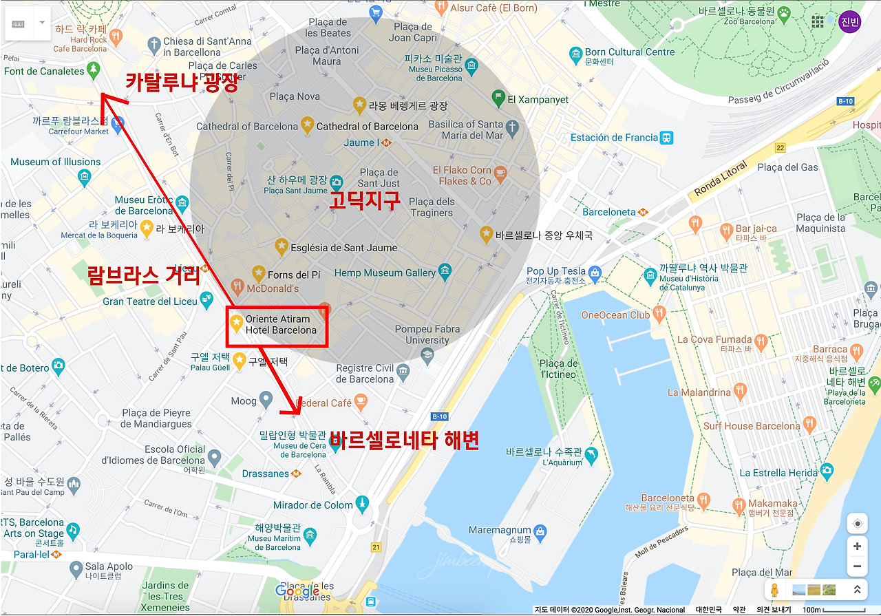 우리는 늘 그렇듯 바르셀로나에 대한 정보 없이 숙소에 도착했고, 우리가 묵은 오리엔테 아티람 호텔(Oriente Atiram Hotel)에서 멀지 않은 거리에 있는 고딕지구를 걷기로 했다. 그리하여 고딕지구 산책 지도 첫 번째는 람브라스 거리에서 시작해 고딕지구의 초입을 걸어보는 코스다. 길을 잃으면 다른 골목으로 다시 걸으면 그만인 곳. 새로운 길에서 새로운 것들을 마주하고, 그런 순간들이 모두 추억으로 남는 곳이다.