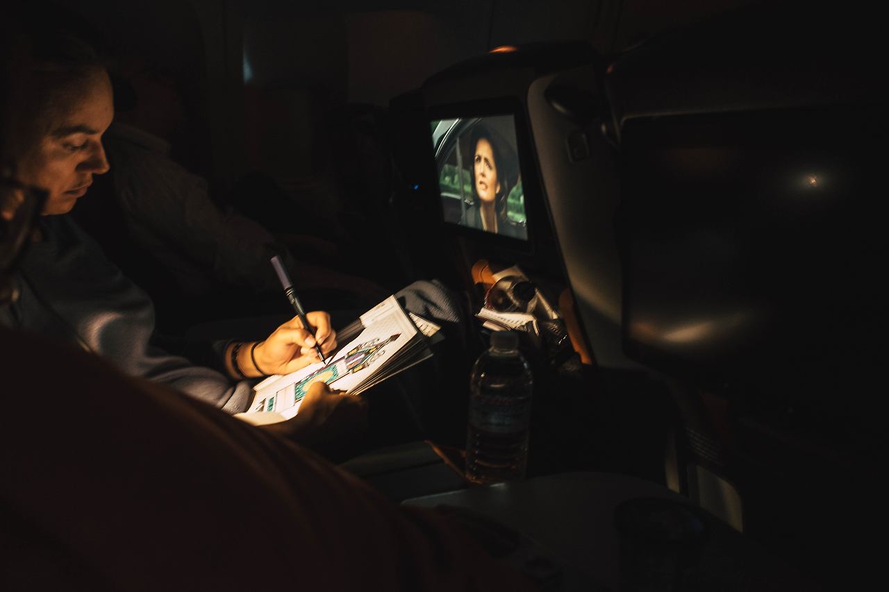 그제야 주위 사람들이 눈에 들어오기 시작했다. 건너편에 앉은 할아버지는 영화에 흠뻑 취해있었고, 옆좌석 외국인은 컬러링북으로 기나긴 무료한 시간을 채우고 있었다. 동시에 비행기에 몸을 실었던 출사단 역시 저마다의 시간을 보내는 데 여념이 없었다.