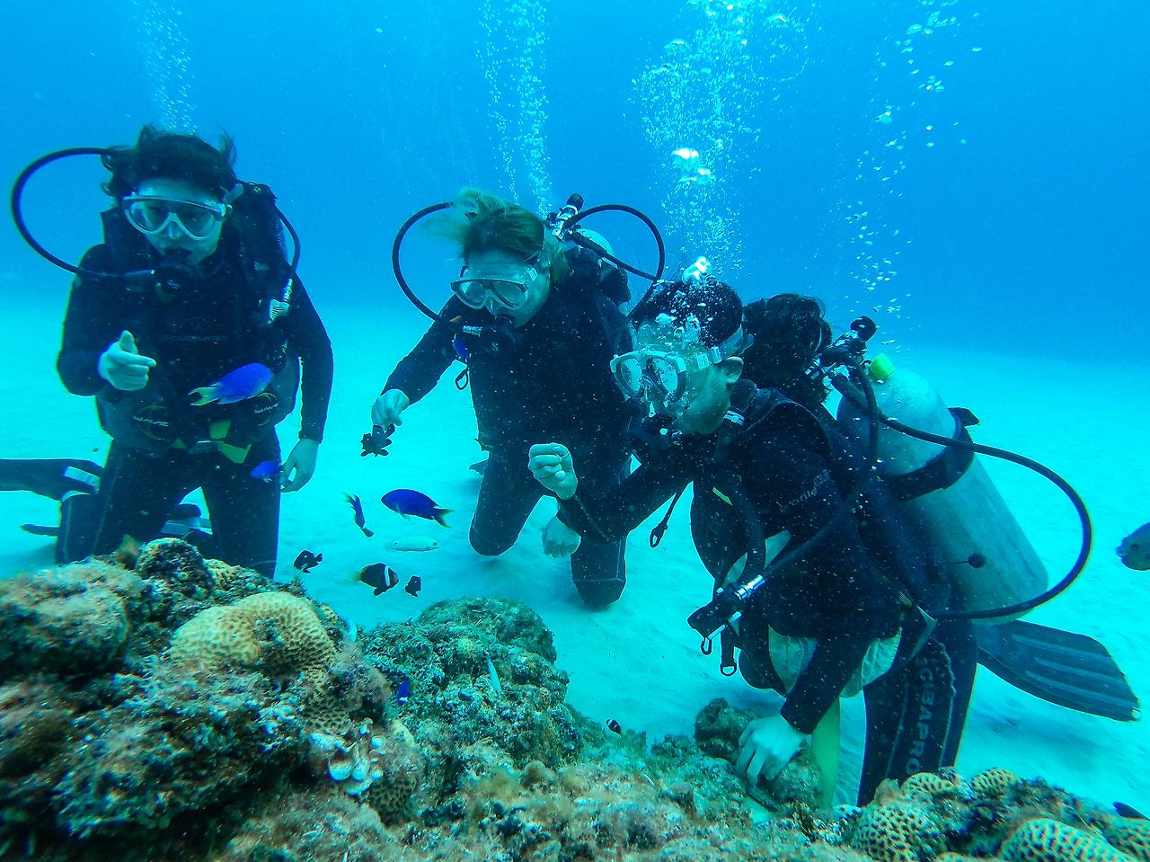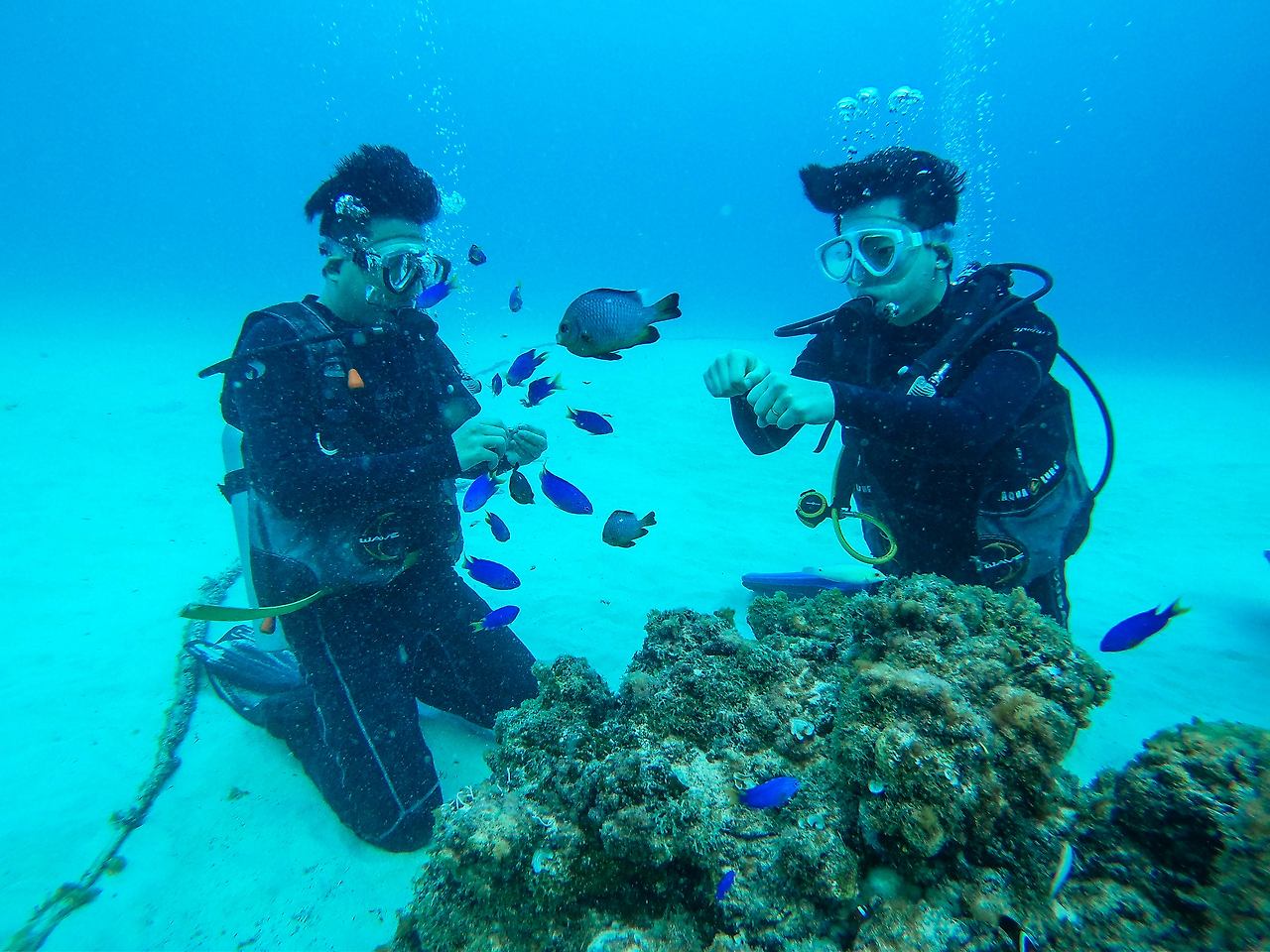 바다가 어느 정도 익숙해졌을 무렵, 우리는 오리발을 신고 밧줄 없이 바다를 헤엄쳤다. 열대어를 만지려다 공기통 무게를 못 이기고 허우적거리기도 하고, 바닥에서 떠오르지 않아 난감해하기도 했다. 산호초 근처에 다다랐을 때 우리 손에 피딩을 위한 먹이가 한 덩이씩 주어졌다. 어디선가 열대어 무리가 나타나 손 주위를 맴돌기 시작했다.