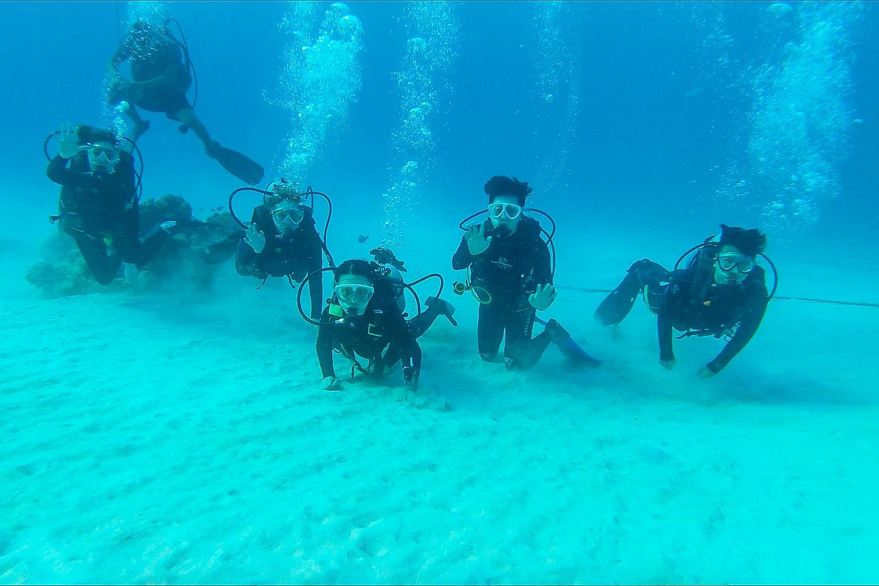 이론 교육과 안전 교육을 마친 뒤 공기통을 매고 해변으로 향했다. 실전 투입 전 얕은 물에서 이론으로 배운 호흡과 수신호를 체크하는 간단한 실습이 이루어졌다. 체험 다이빙에 도전한 이들이 얕은 바다에서 둥글게 손을 잡고 공기통을 매고 물속에서 걷는 방법, 호흡하는 방법, 수신호를 다시 한번 체크했다.