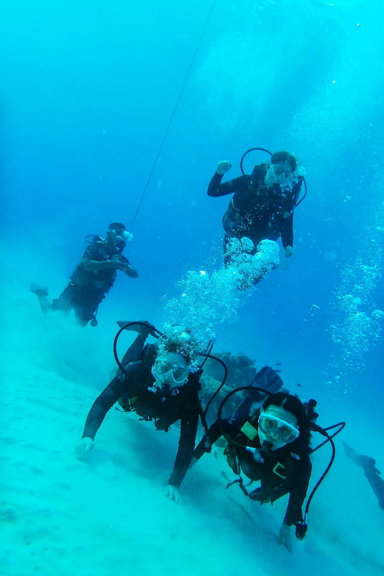 처음에는 바다 아래 깔린 기다란 밧줄을 잡고 바닷속에서 헤엄치는 연습을 한다. 이때도 강사님은 호흡을 제대로 하고 있는지, 수경에 물이 차지 않았는지, 수시로 이퀄라이징을 하고 있는지 미리 약속한 수신호로 한 명 한 명 체크하기 바빴다. 앞에는 친절한 강사님이 있고, 현지인 보조 강사가 부표를 끌고 우리 뒤를 따르고 있어 안심이 됐다.