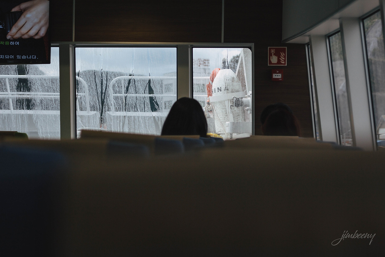 월요일 오후부터 화요일까지 내내 바람이 거세게 불었다. 부산에는 잠깐 비가 내렸다고 했다. 대마도로 올 때 아무도(오빠는 아무래도 모르겠다) 멀미를 하지 않았던 터라 우리 셋은 기세 등등하게 배에 올랐다. 그 와중에 오빠는 혼자 멀미약을 사서 먹었다. 배에 오르자마자 보이는 광경에 살짝(?) 겁을 먹었다. 오는 길이 얼마나 험난했는지, 사방으로 둘러싸인 배 창문은 아직도 물줄기가 흐르고 있었다. 저 정도면 일반석인 1층은 거의 잠겨서 온 게 아닌가 하는 의심이 들었다. 방송에서는 무료로 멀미약을 나눠주고 있다며 멀미약 복용을 권유했다. 우리는 나란히 앉아 멀미약을 삼켰다. 그리고 누구보다 빨리 잠이 들겠노라, 거의 동시에 다짐했다.