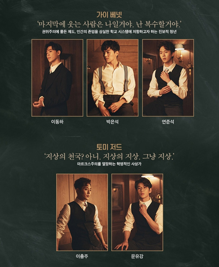 <어나더 컨트리 Another Country> 두 주인공 가이 베넷(연준석)과 토미 저드(문유강)는 다수로 칭해지는 동그라미들과 어딘가 다른 세상 즉, 네모에 속해 있는 사람이다. 1930년대 영국 사립학교라는 이 연극의 설정상 계급이 명확하고 규율은 엄격하다. 또한 권위를 중시하는 이들에게 자신들의 세상 즉, 학교의 규율에 반하는 다름은 곧 틀림으로 받아들여진다.