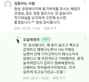 자기 삶을 쓰는 글쓰기 모임에서 반가운 댓글을 봤다. 토요일 오후에 내 가슴이 요동쳤다. 나에게 글을 잘 쓰니 심각하게 작가되심을 권하는 섬세한 글을 쓰는 이였다.