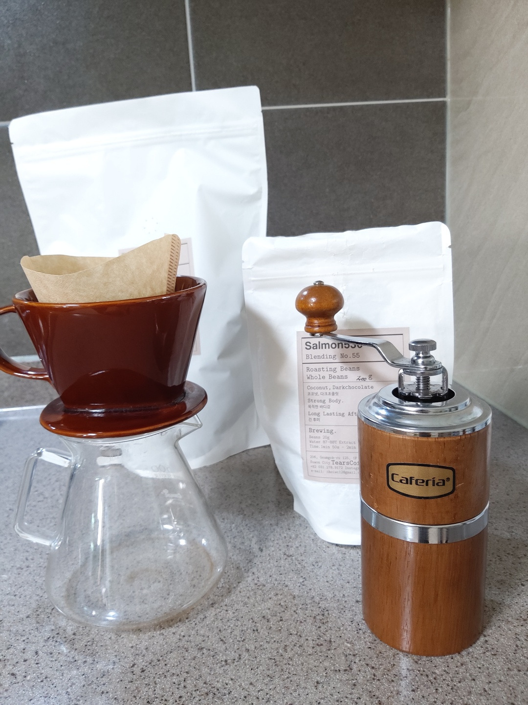 자동 커피 그라인더를 구입하니 전원을 꽂아야 했다. 주방 테이블 안쪽에 자리를 잡았다. 커피를 내리려고 할 때마다 식탁 옆 선반에 놓여있던 커피 기물들을 사용하기가 번거로웠다. 한동안은 선반에서 커피콩과 서버, 드리퍼, 필터를 챙겨서 식탁에 준비하고 주방 안쪽에서 커피 포트에 물을 끓이고 자동 그라인더에 커피를 갈아서 커피를 내렸다. 식탁을 돌아 드립 커피 준비물을 챙기고 다시 주방 안쪽에서 커피콩을 가는 동선이 어수선했다. 그래서 필터를 가스렌지 후드 옆 선반으로 옮겼다. 커피콩은 작은 봉투에 덜어서 아일랜드 식탁에 올려두고 서버와 드리퍼도 옆에 놓아두었다. 하나씩 옮기다보니 이제는 주방 안에서 핸드드립 커피를 내리는 최적의 동선이 만들어졌다. 어느 날 문득, ‘자동 그라인더 하나 바꿨다고 커피 내리는 패턴이 완전 바뀌는데, 업무의 변화 또는 새 사람이 온다면 흐름을 잘 익혀야 겠구나’ 하는 생각이 들었다. 그러면서 내가 하는 일의 큰 변화에 느리지만 잘 적응해 온 나를 돌아보았다. 언젠가 며느리가 우리가족이 되면 새로운 규칙과 질서를 빨리 받아들여야겠다는 엉뚱한 생각이 들었다.