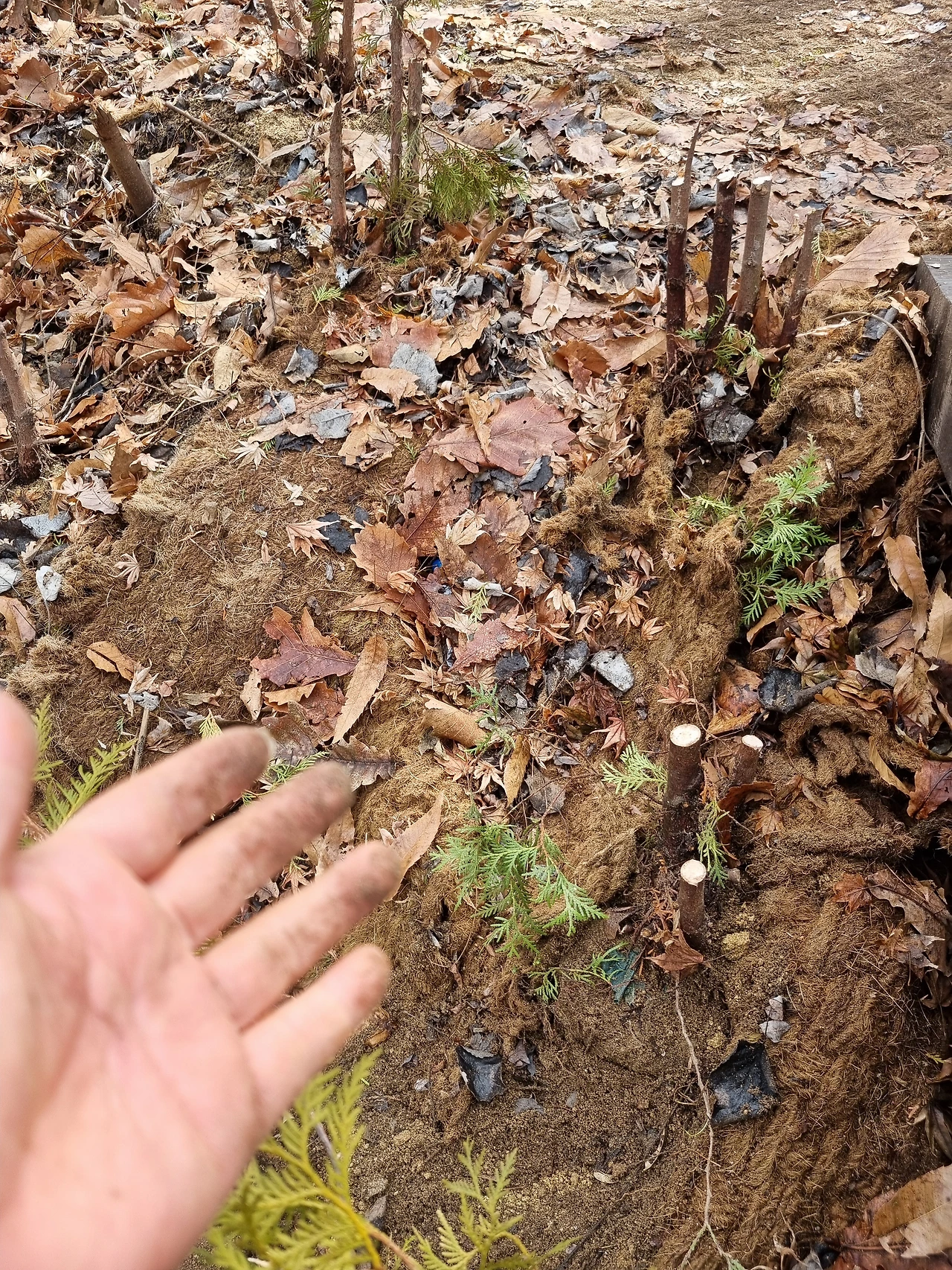 산을 걷고 햇살언덕에서 빙그르르 햇살 맛사지를 하고 계단쪽으로 내려왔다. 앗! 누군가 꺾여진 측백나무 가지를 정돈했다. 나무 두 덩이는 수요일 그대로 쓰러져있다. 조심해서 나무를 세웠다. 주위의 흙을 맨손으로 집어서 살살 덮었다. 흐뭇하고 뿌듯하다. 나무를 심은 기분이다.