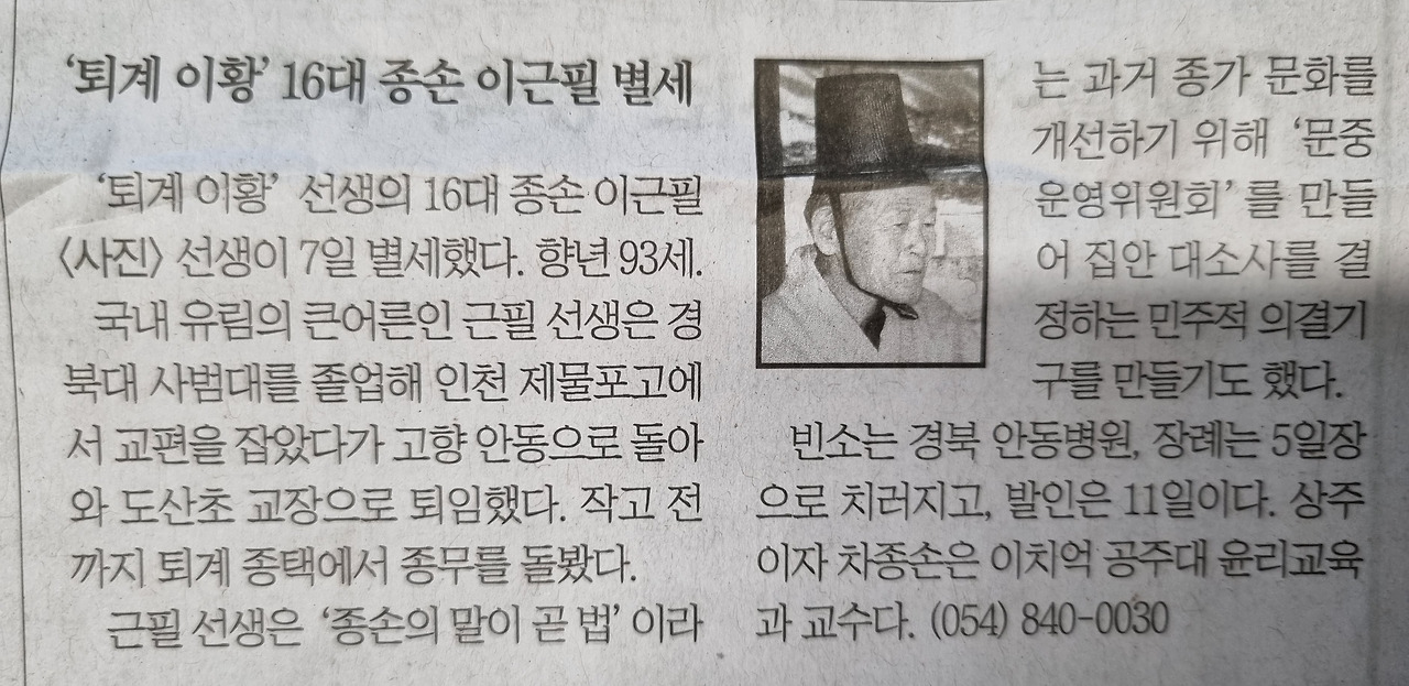 퇴계 16대 종손이신 이근필 선생은 종가 개혁과 선비 문화 전파에 앞장선 분이다. 도산서원선비문화수련원 설립자로 퇴계 선생님의 ‘배우면서 삶을 마친다’는 학이종신(學而終身) 정신을 전파하고 여성의 사당 출입을 430여 년 만에 가능하게 하신 분이다. 도산서원은 선비 문화 체험을 통해 사회 윤리 함양에 앞장선다. 지난 6월에 1박 2일 묵으면서 자원봉사하시는 어르신들의 환대를 직접 체험한 나는 이근필 선생의 사망 소식이 안타까웠다.