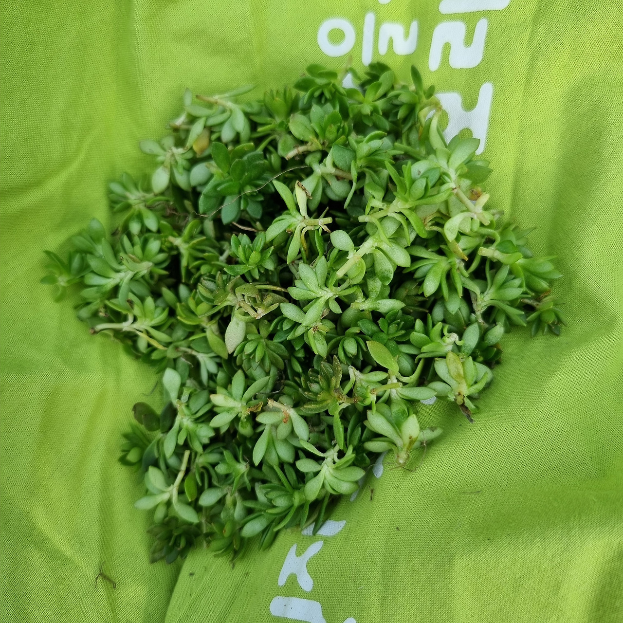 하루 종일 해가 잘드는 곳이라 돌나물이 통통하고 예쁘다. 줄기식물처럼 땅 위에서 줄기를 타고 예쁘게 달렸다. 제법 큰 걸로 한 줌이 안되는 양을 뜯었다. 어제 뜯은 것도 있으니까 한 끼 무쳐먹으면 될 거 같았다. 집에 와서 딸아이에게 한 줌 되는 돌나물과 사진 찍은 것을 보여줬더니 꽃 아니냐고 묻는다. 진짜 모르는 사람은 다육이 식물인 줄 알만큼 예쁘다. 요 작고 예쁜 걸 뜯었다.
