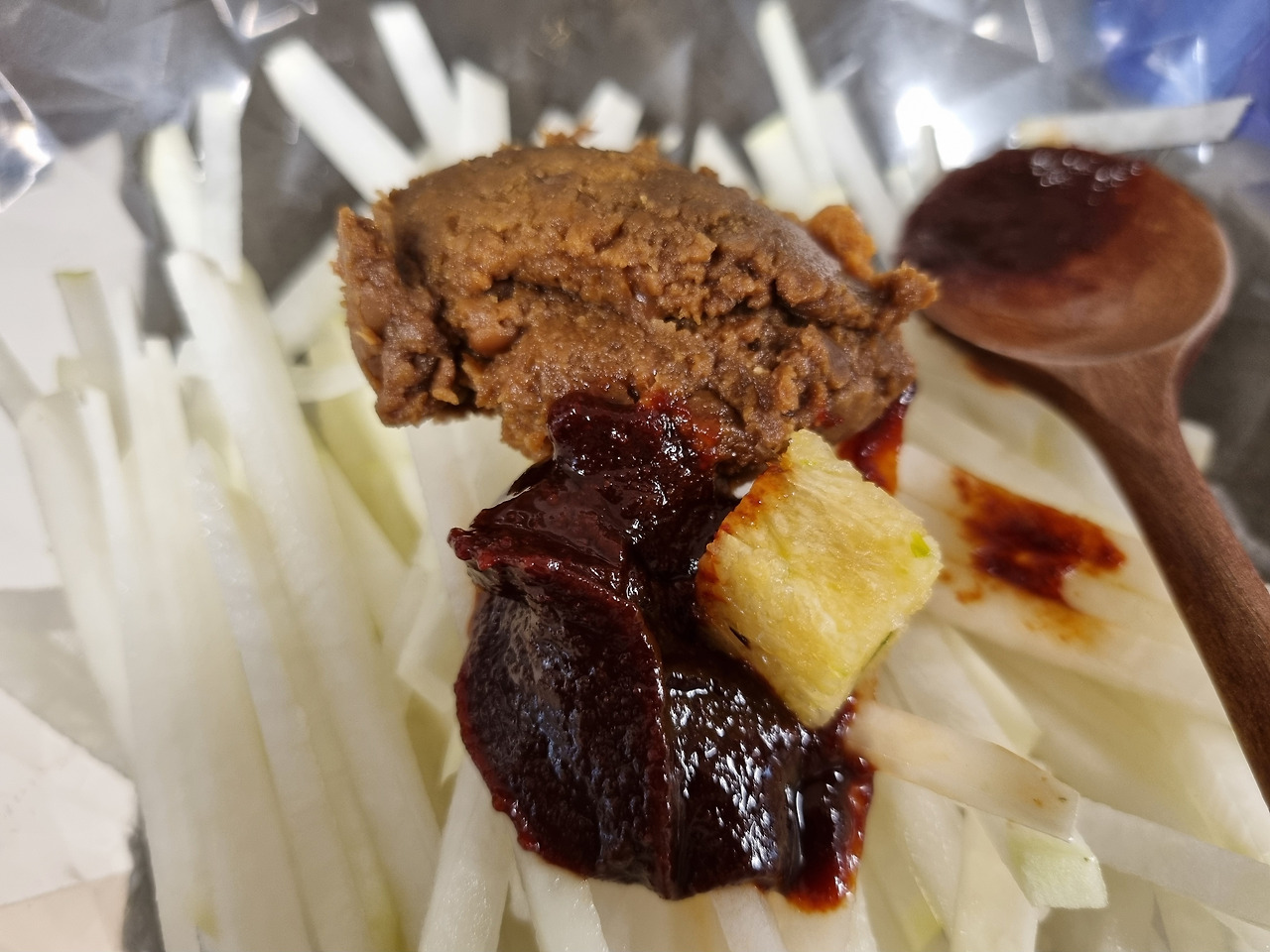 4. 된장 한 스푼과 고추장 반 스푼을 기본 간으로 한다.