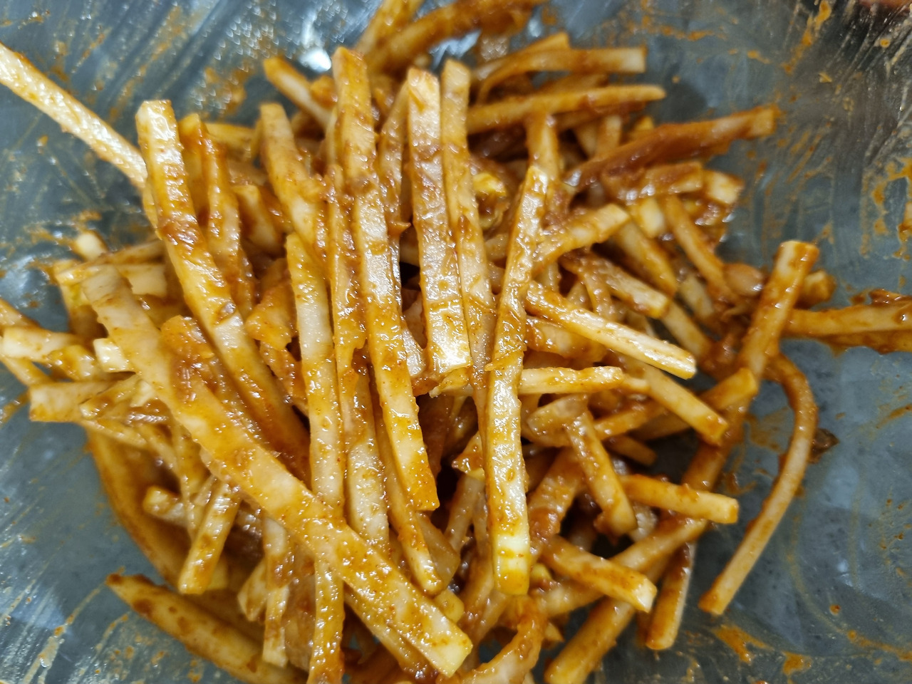 3. 무를 채썬다. 조금 두껍게 썰어졌지만 씹는 맛이 있었다. 무채를 재보니 320g이다.